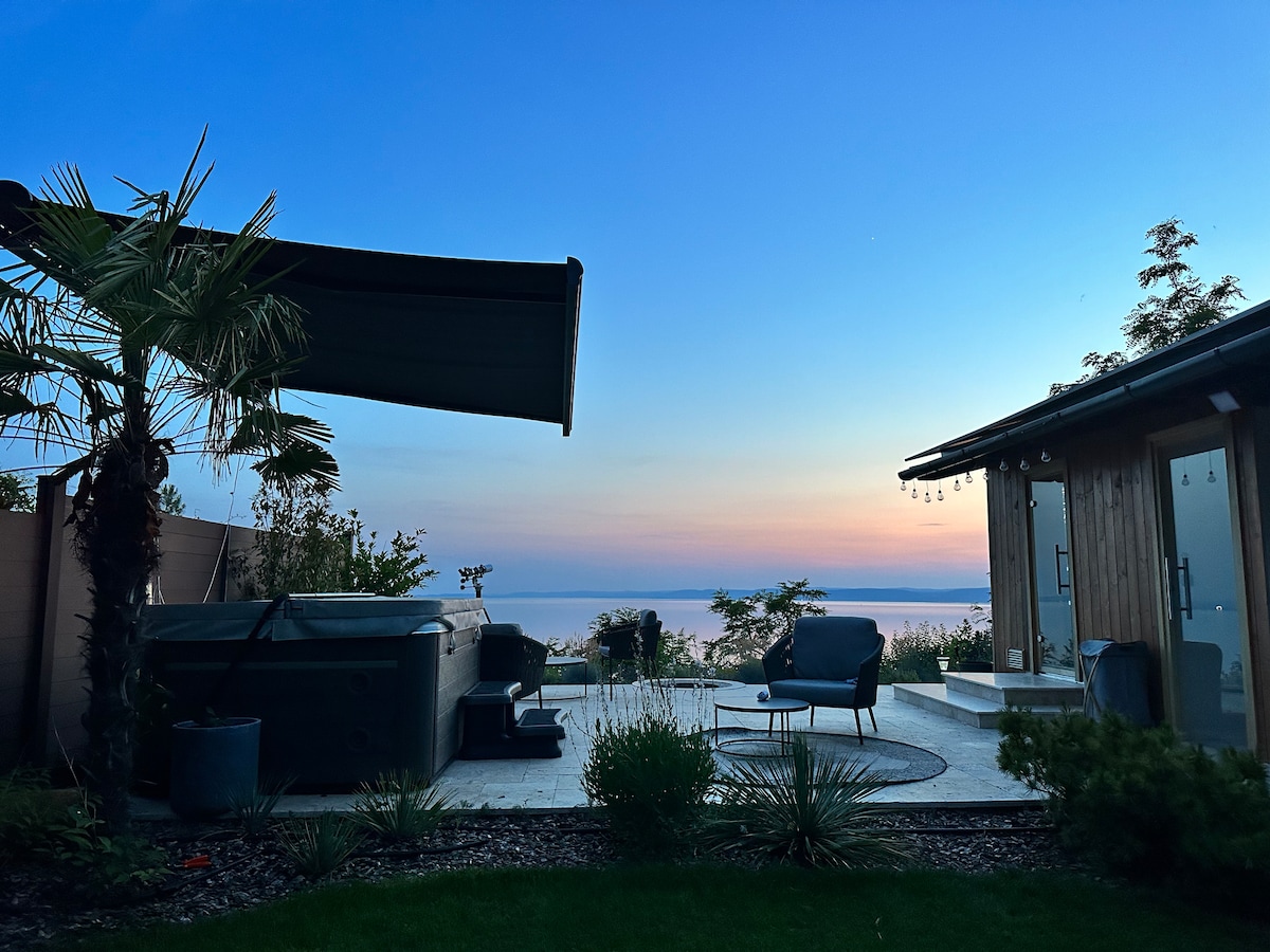 A truly special place just an hour from Budapest. A newly built "old house" with fully opening doors onto the huge patio overlooking Lake Balaton’s biggest bay. See wicked storms approaching over the lake, the always changing clouds and colours of the sky. Welcoming anyone who values this unique experience and the warm design of the house. Get away to the studio if you need to work while still enjoying this special atmosphere. Winter is also very special with breathtaking sunsets and a hottub.
