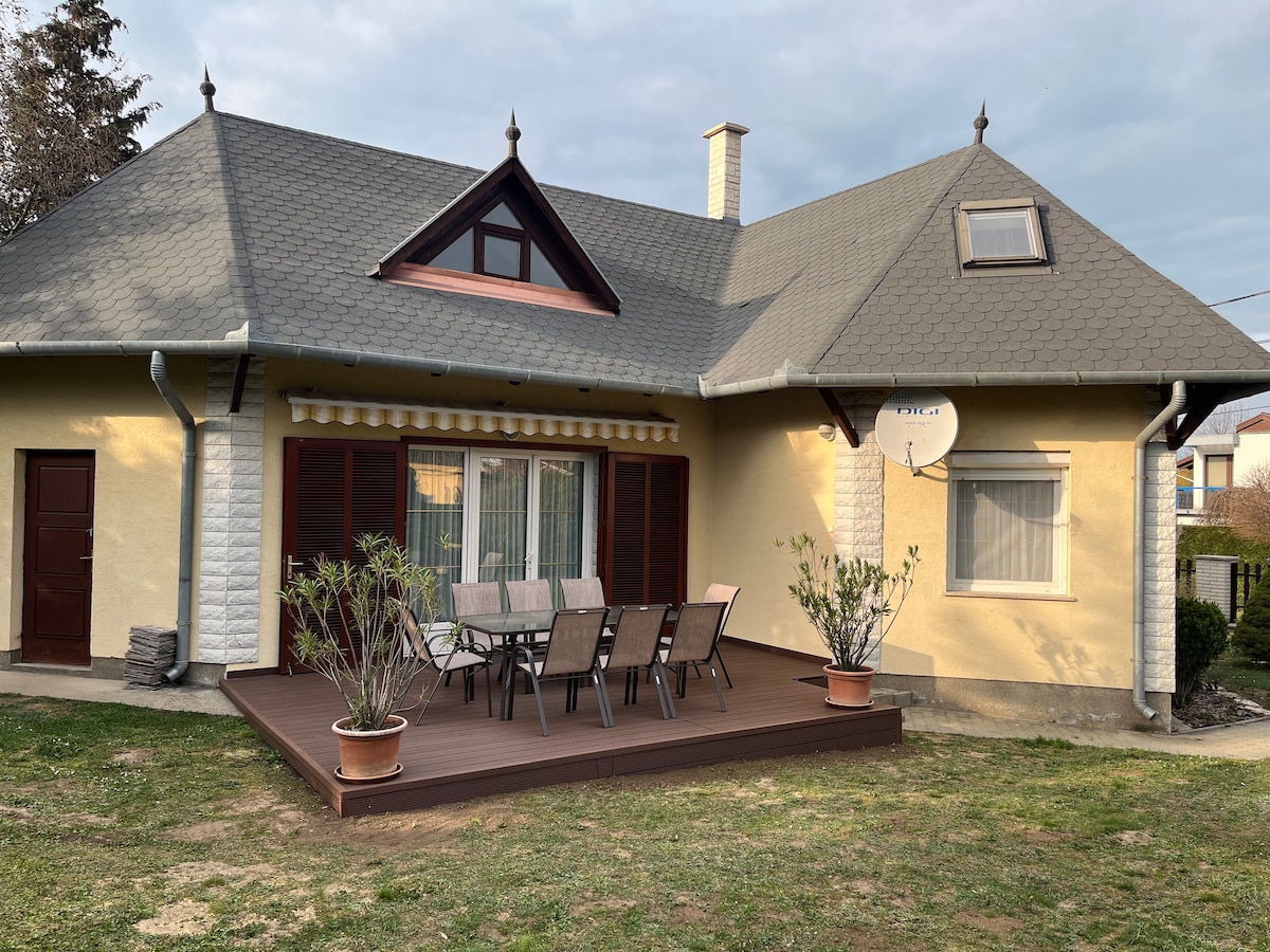 Our brand new holiday home is open for rent all year around in a safe and calm environment. Situated right next to the lake Balaton, we are 5 min walking distance from the popular Silver beach, wich is free of charge. 10 min from Kálmán Imre mall where you can enjoy many restaurants as well as other amusements. From 3 minutes walk, across the elictric railroad tracks you can find a supermarket, a pharmacy and the well known Öreg Halász restaurant.