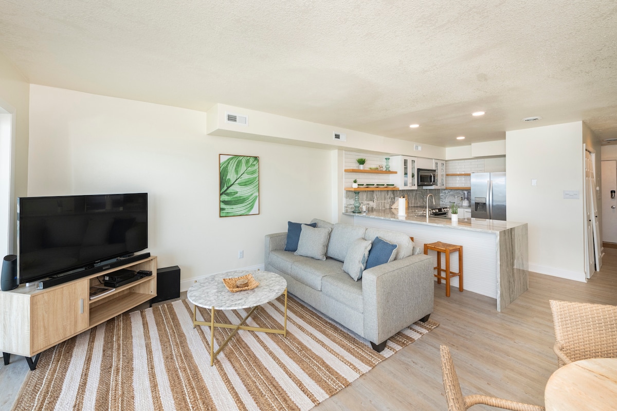 This spectacular ocean view condo with top notch 2022 renovations is just steps from the beach. Be swept away by the view of the rolling waves, whitecaps, and the OKI Pier as you relax and enjoy a beverage on the balcony. You will also be treated to a breathtaking sunset as the colors change each minute across the sky. Retire to the living room and rest your tired feet on a comfy sectional sofa as you interact with others in an aesthetically pleasing open floorplan setting.