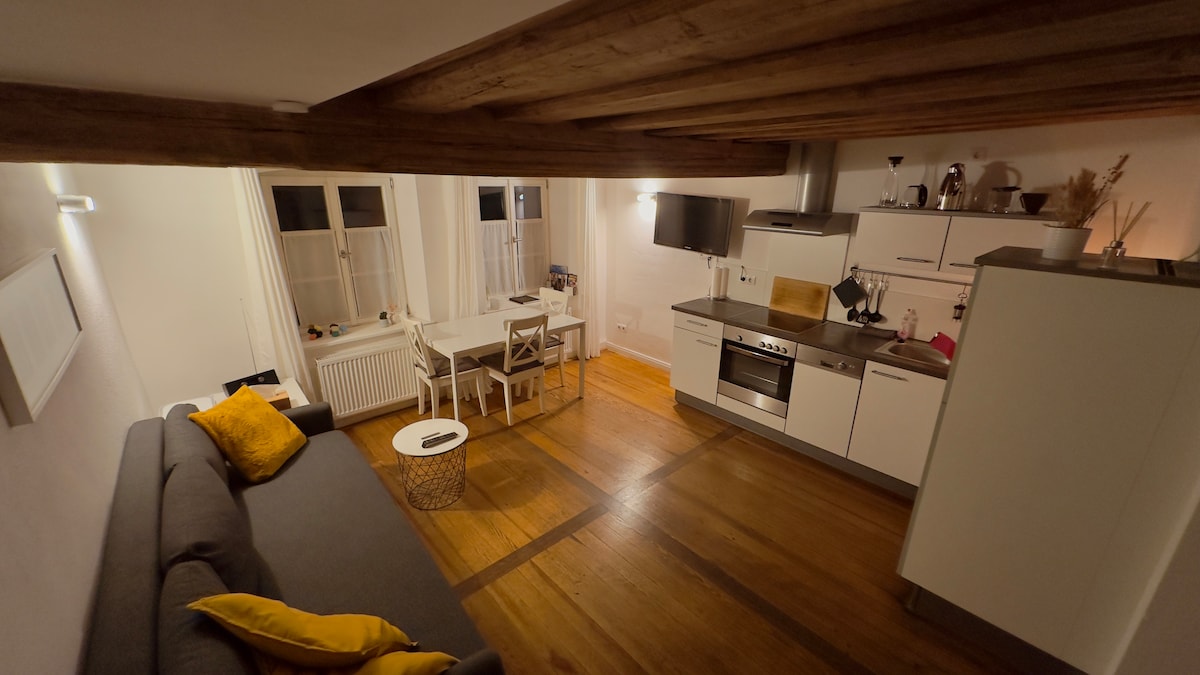 Apartment at City Hall | Bamberg We like to invite you to our apartment "Am Rathaus" in the heart of downtown Bamberg. Discover our beautiful World Heritage City on the Regnitz. We offer the best possibility. You live directly in a 600 year old, beautifully restored historic building in the center of the city. Outside the front door, you can park your car for 6, - EUR per day in our private underground garage, but we also offer space for bicycles. The apartment consists of a cozy living room with a spacious kitchen that invites for cooking, but also with sofa for relaxing, a bathroom with shower and a cozy bedroom with double bed and super comfortable mattress. The building was completely renovated in 2010. You will find everything that makes any modern living environment: household appliances, free internet access, flat-screen satellite TV. Relax on our idyllic courtyard. Here you can enjoy the silence, although outside the door all the events of the city of Bamberg happen. In all seasons, our apartment is an ideal starting point for your discovery of Bamberg. In winter is the Christmas Market situatied directly in front of our door. When you open the window you can enjoy the smell of roasted almonds and mulled wine. In the spring the life on the city streets wakes up and you can stroll through the various markets. In summer, many wonderful cafes invite you for a coffeebreack right around the corner and also the unique "Bamberg-Bierkellers" are not far. In autumn Bamberg offers its visitors also a beautiful ambience and you can enjoy a variety of museums. No matter whether you are planning a day trip or spend a long weekend in the city of Bamberg or longer want to go on holiday, our apartment is at your disposal. Call Us. You can reach us at the number +49 951-20853365. Do you have any special requests? We are flexible, a cot is not a problem. Your Denzler | Öhlein family