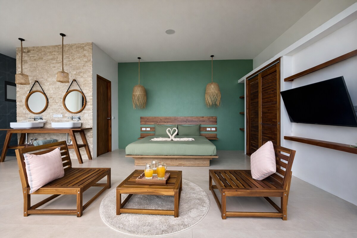 Stylish Eco-Conscious Studio with Breathtaking Views Escape to our minimalist, stylish eco-studio where nature meets convenience. This comfortable retreat features a king-size bed and offers stunning sea and jungle views from every corner—the sofa, bed, workspace, and private terrace. Enjoy the perfect balance of serene natural beauty and a central location, making it easy to explore while feeling a world away.