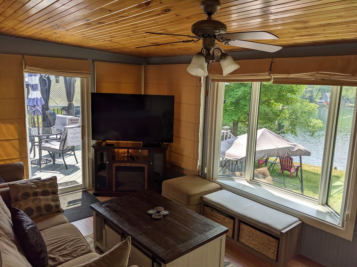 Four Season Cottage on Stimears Lake. 2 bedrooms, 1.5 bathrooms. View of the lake from kitchen, living area and primary bedroom. Small Hot tub (it is a 3 person hot tub / not a large hot tub), games room, dock, waterfront. Summer Only - kayak & row boat + above ground pool. Close to downtown Bancroft, snowmobile/ATV trails, hiking, great fishing, public boat launch, small quiet lake. Please review listing very carefully before booking. Our listing & photos are very accurate & real.