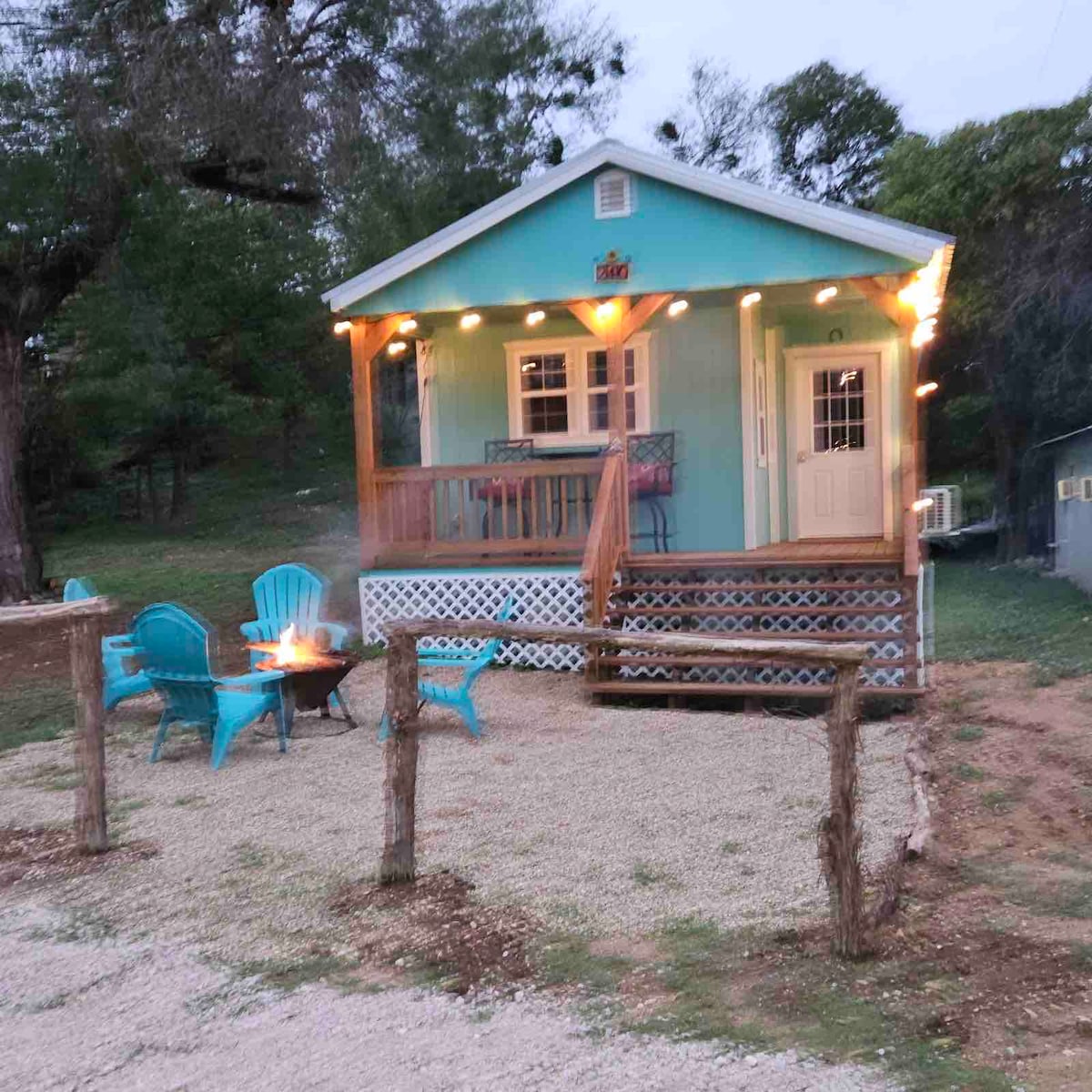 Get away from it all and not leave any comfort when you stay under the stars in this tiny home one of only 5 in this beautiful RV resort park. The park has swimming pool,picketball courts,convenience store, outdoor picnic area , river tubing , mini golf , BBQ pits . The home itsef has a full kitchen. living area has a pull out queen bed. The bathroom has a walk in shower . The bedroom is pretty spacious wt queen bed . Quiet Tiny home with all comforts .