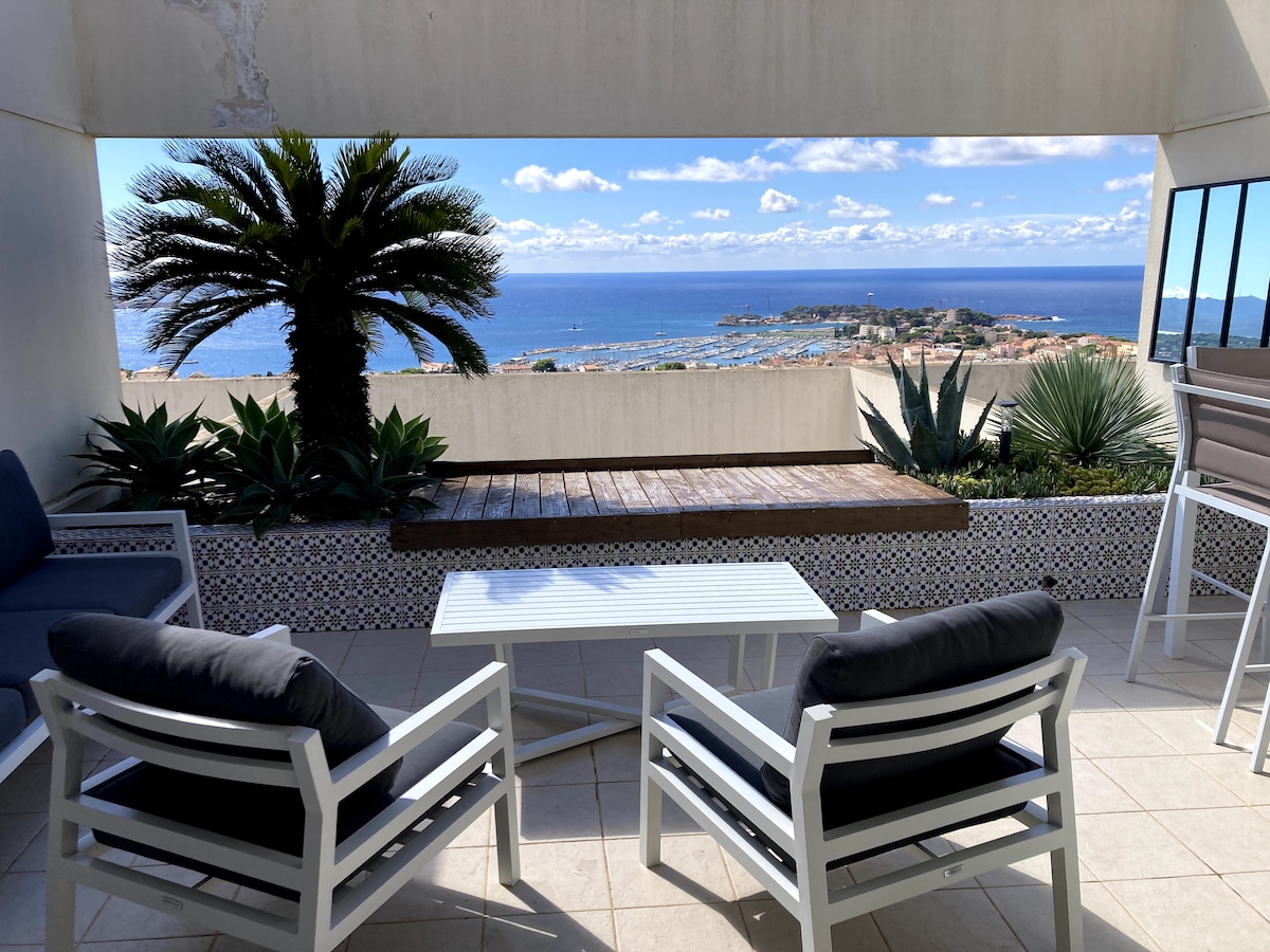 Ce bel appartement-villa avec Spa intérieur et terrasse vue Mer vous offrira une parenthèse de douceur dans un cadre unique sur les hauteurs de Bandol, proche du centre ville, des plages et des commerces. Il se situe dans une résidence sécurisée par un portail électrique, en rez de jardin avec un accès direct sur le palier depuis le parking privée de la résidence. Vous pourrez garer votre véhicule à proximité du logement. Vous bénéficiez d'une jolie vue sur la baie de Bandol et l'île de Bendor.