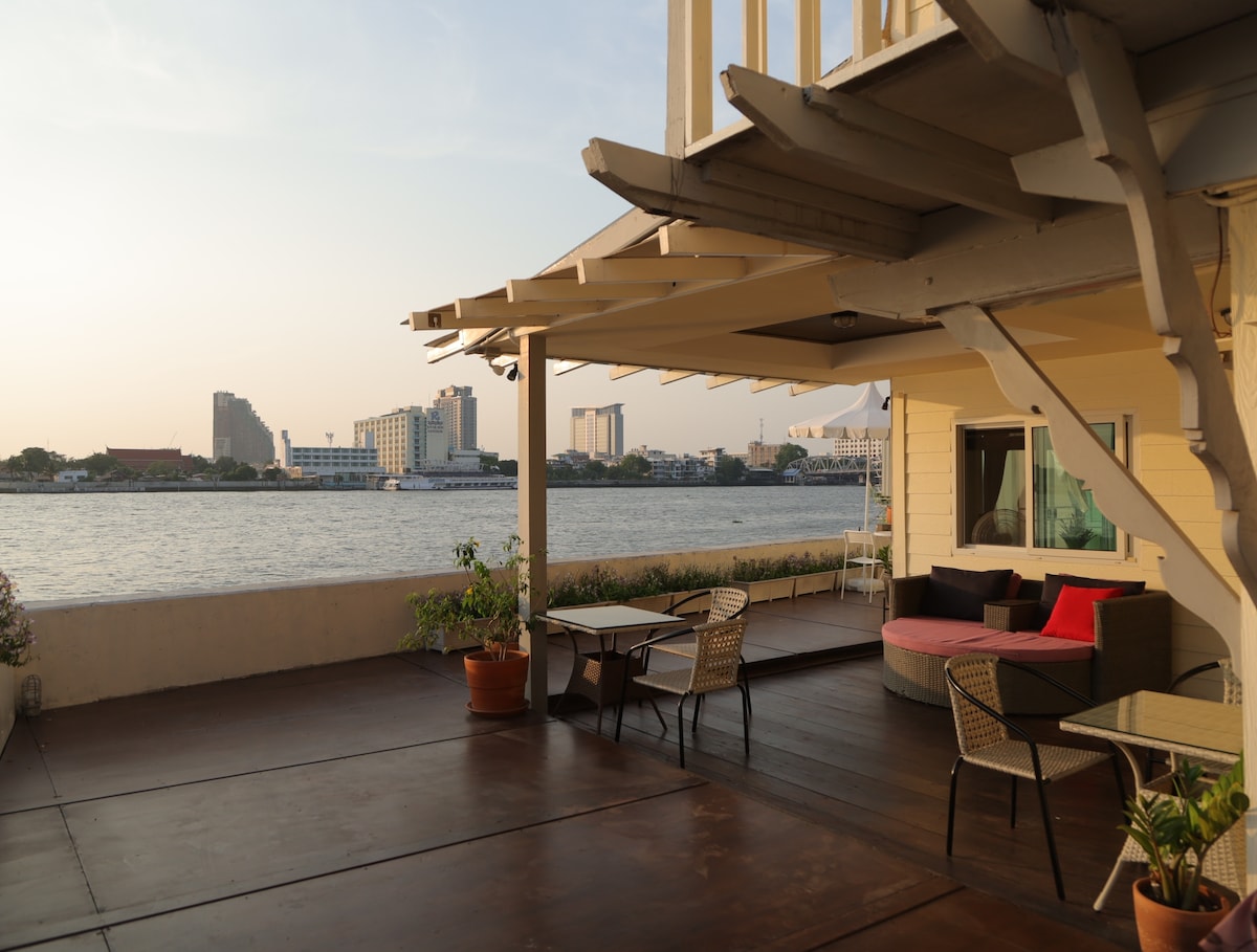 Nestled along the scenic Chao Phraya River, this cozy private property offers three unique Airbnb rooms. The ground level serves as a welcoming lobby and waiting area, while the building spans four floors, each featuring you own bedroom, bathroom and terrace for a peaceful, private stay. The fifth floor is a shared spacious rooftop terrace, perfect for enjoying river views and relaxing outdoors. there is no elevator, so the property is not recommended for seniors with mobility challenges.