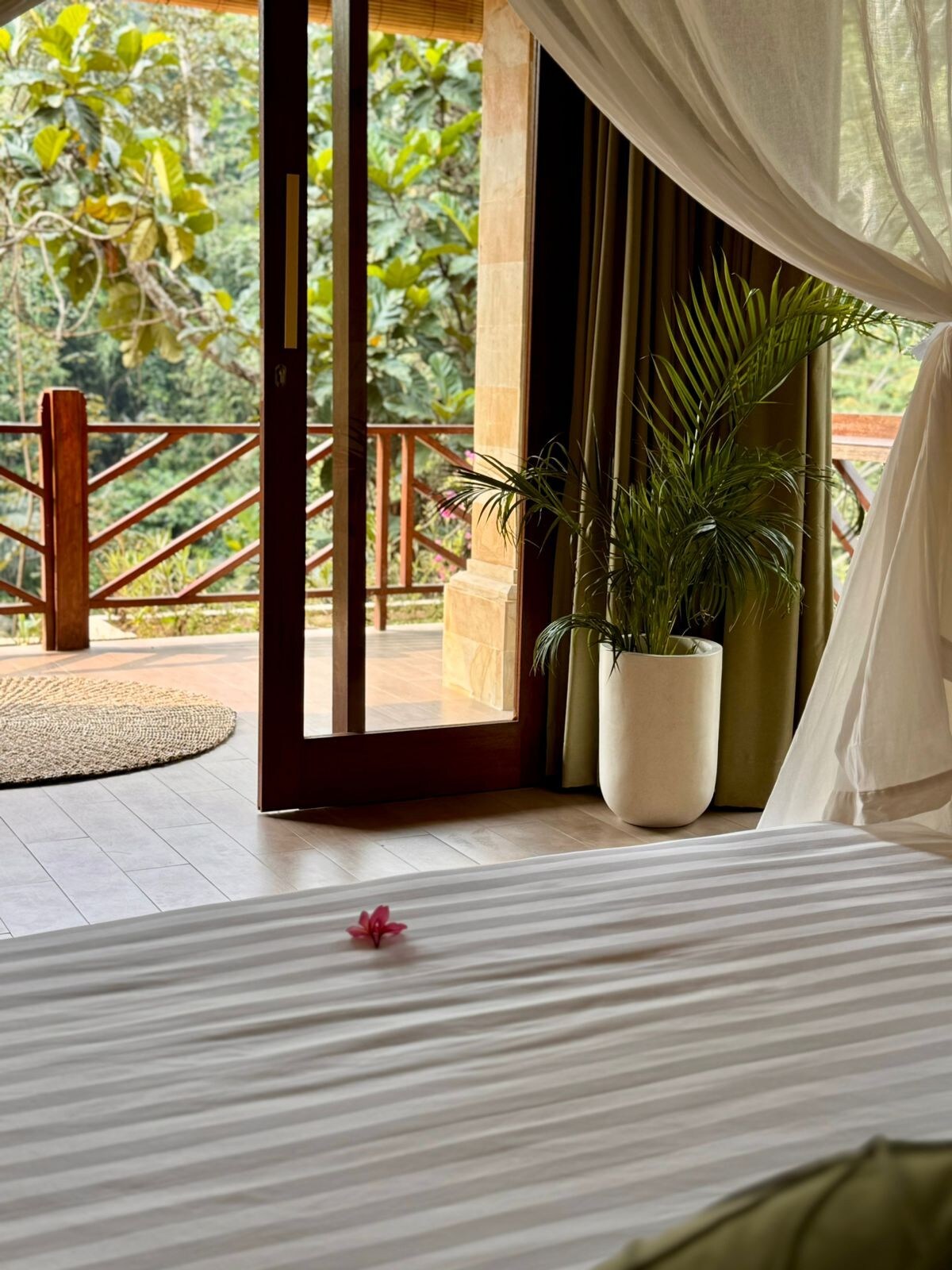 Unwind in this serene boutique stay nestled deep in lush jungle surroundings, just 10 minutes from Ubud city centre. This private jungle apartment feels as if it floats above the river, surrounded by treetops and nature. A spacious outdoor living area invites you to relax, work, exercise, or simply listen to the river below. The bedroom is fully enclosed for comfort. Meals can be ordered from the on-site restaurant. A village walk leads to a local waterfall for an authentic Bali experience.