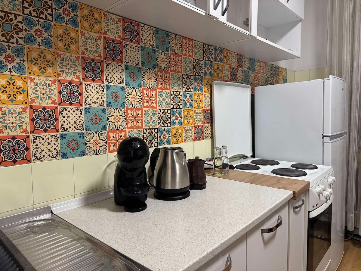 Modern, one-bedroom apartment with balcony, fast Wi-Fi, A/C and free parking. Easy walk to the Main Square, Old Bazaar, malls, cafés & restaurants. Perfect for digital nomads and travelers who can enjoy stylish, clean and peaceful stay! Sleeps 3 (queen + sofa bed), with full kitchen (oven, stove & dishwasher), bathroom (shower, washing machine, towels) and balcony. ✈️ We offer airport transfers for extra comfort (additional cost). Stay 10+ nights get one-way free, 14+ nights both ways free!