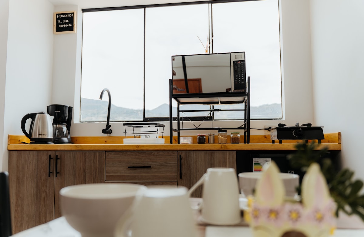 Enjoy a unique stay in this charming little loft, ideal for a single person or couple. Located in a quiet area of Cajamarca, this space combines comfort, design and a beautiful view of the city that you can enjoy from sunrise to sunset. The Loft has everything you need for a comfortable stay: a double bed, an equipped kitchen, a private bathroom, Wi-Fi, and windows that fill the room with natural light. Perfect for resting, working or exploring the city.