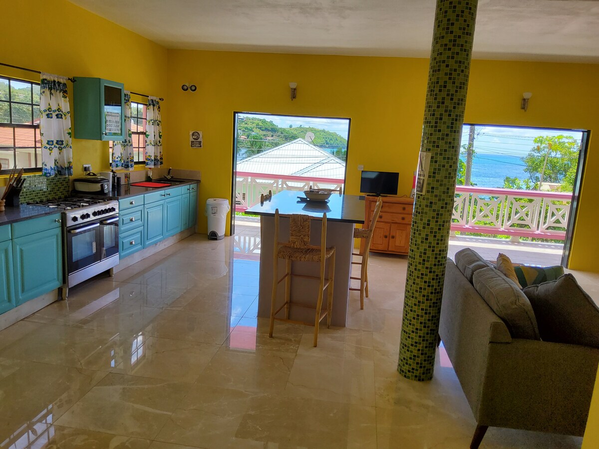 If you're looking for tranquility, peacefulness and a scenic location, then Flamboyant Inn is where you should be . Nestled at the hilltop, with a breathtaking view of the beach and the village of Laborie, this location offers a 10 minute walk to the beach, major restaurants, the market and nightlife activities. It is ideal for couples, business travellers, and families (with kids).