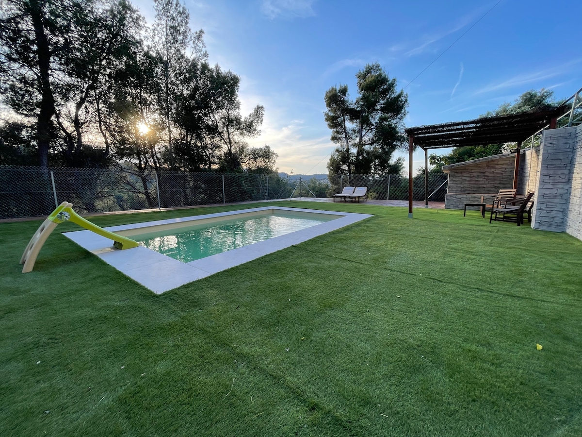 Beautiful house 20 minutes from Barcelona, perfect to spend a few quiet days surrounded by nature. Independent entrance and total privacy. You will find everything you need and with great attention to detail: 4 spacious rooms with dressing room and integrated bathroom, A/C, TV, parking, piano, Wi-Fi, kitchen, living room, garden with spectacular views, swimming pool, barbecue, are some of the many details that will make you spend a few days of peace and fun. Capacity for up to 12 people and 570 m2 available.