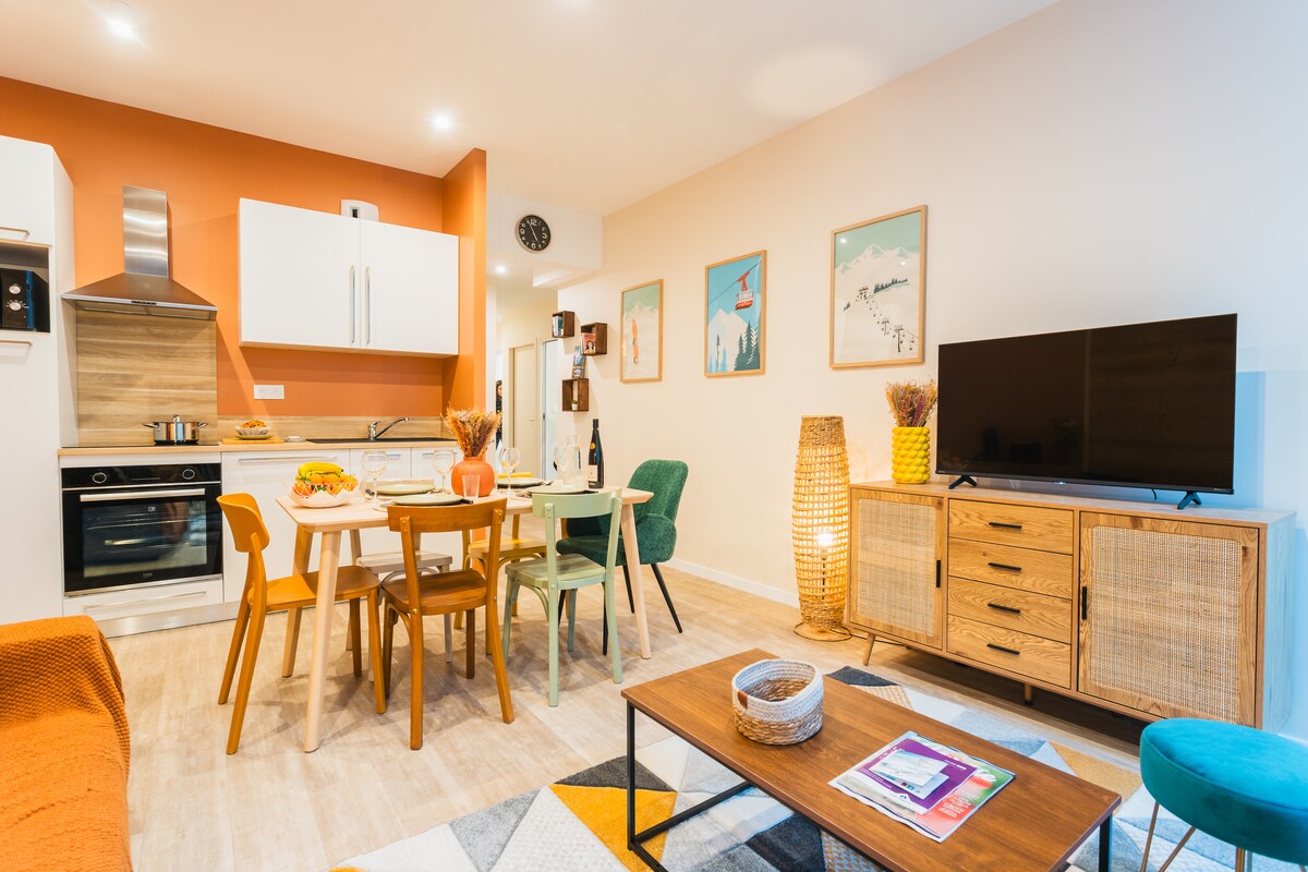 Close to the city center, in a fully renovated residence with quality services, come and discover this cozy 2-room duplex apartment on the 3rd and top floor with elevator, which can accommodate up to 4 people. Very bright with beautiful views of the mountains. It is composed of an equipped kitchen, a large living room with sofa bed, a bathroom with washing machine, separate toilets, upstairs a bedroom (160 x 200 bed) Free Wi-Fi, 1 ski room, parking.