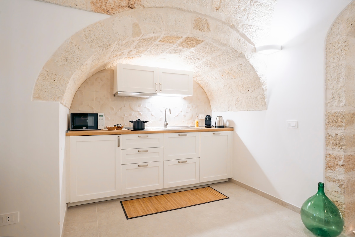 Apt 9 RIVA indulge in luxury at Palazzo di Lumi Palazzo di Lumi offers 10 apartments and can accommodate up to 20+ guests. Stylishly interior designed and sustainably renovated, each with kitchen, access to SPA with sauna and a pool. As well as free access to rooftop terrace and laundry room. Ideal for couples and groups. Perfectly located near Puglia's famous towns, 15 minutes from beaches, 20-25 minutes from Polignano a Mare and Monopoli, and just 30 minutes from Bari airport.