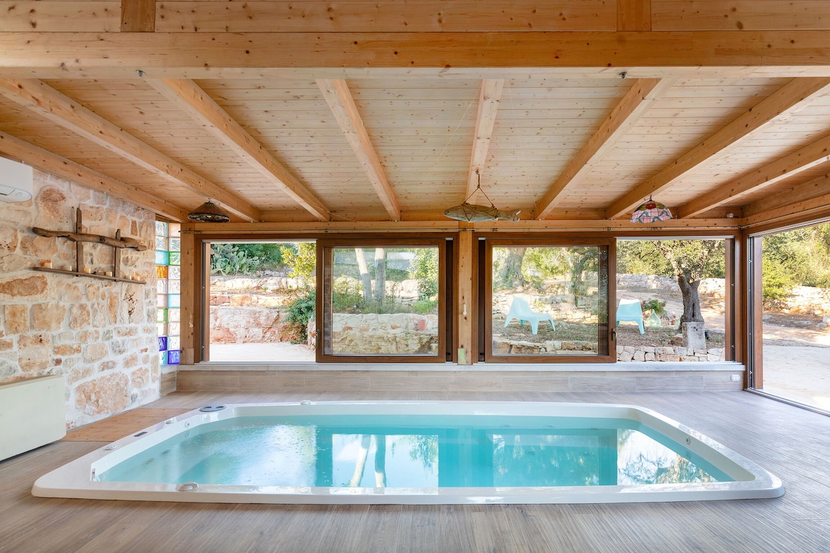 Trullo Amarcord is a unique holiday home - style, luxury and charm in picturesque surroundings. In a small and quiet village with tens holiday homes, Trullo Amarcord is at just 15 minutes drive to some of the most beautiful beaches of Puglia. Inside the designer décor and sophisticated fittings complement the distinctive features of a traditional trullo even includes a SPA heatead UV disinfektion pool. So much love and attention has been lavished on the creation of this vacation home.