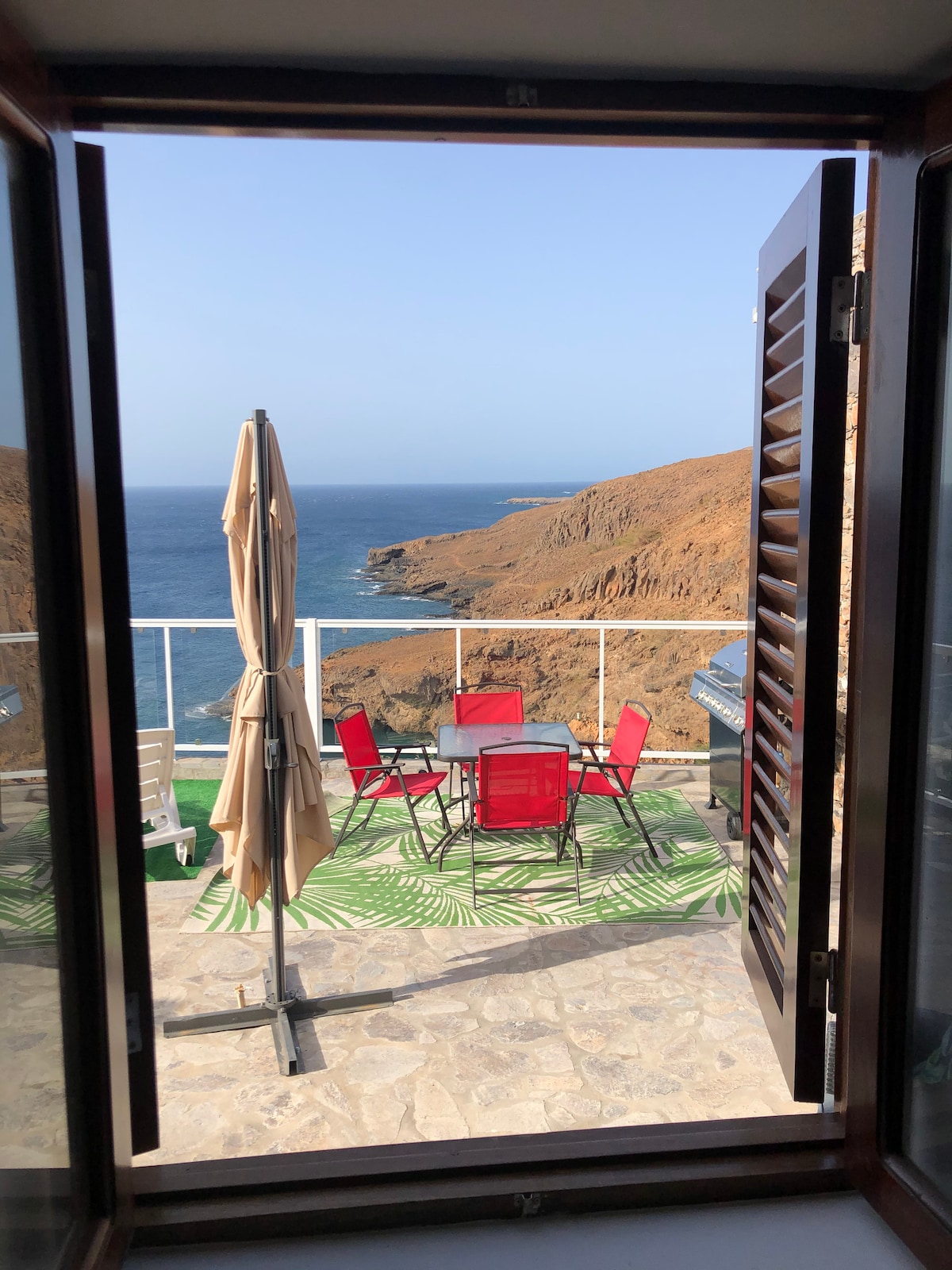 At the exit of Cruzinha, the house is independant and have a sea view ideally exposed (sun all day). A bedroom with a double bed (quality mattress, wardrobe) with sea view - a dining room with an equipped kitchen (table for 2 people, fridge, freezer, crockery, 4-burner gas hob, sink, electric kettle) - a bathroom with hot water, shower, sink and separate toilet. Private terrace with sea view. GPS: 17.168115, -25.165849