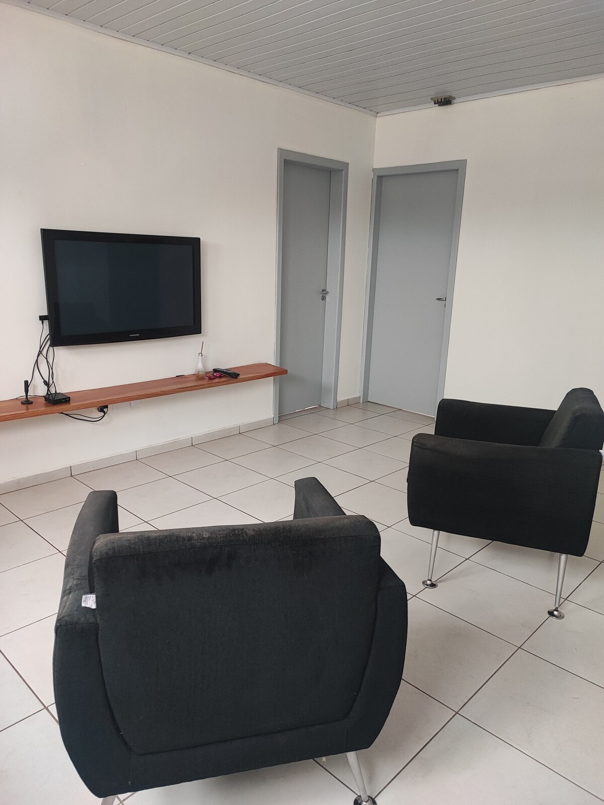 - En-suite with queen size bed, air-conditioning - Bedroom with double bed, TV, air-conditioning and work desk - Balcony with barbecue grill - Living room with retractable sofa and TV - Full kitchen, with fridge, stove, electric oven, microwave, sandwich maker, kettle, blender, pots, dishes and utensils - Dining table with 8 chairs - Washing machine - Bed and bath linens - 500 mb Wi-Fi - 2 covered parking spaces - 2 bathrooms - 1st floor ATTENTION: There are personal belongings on the property.