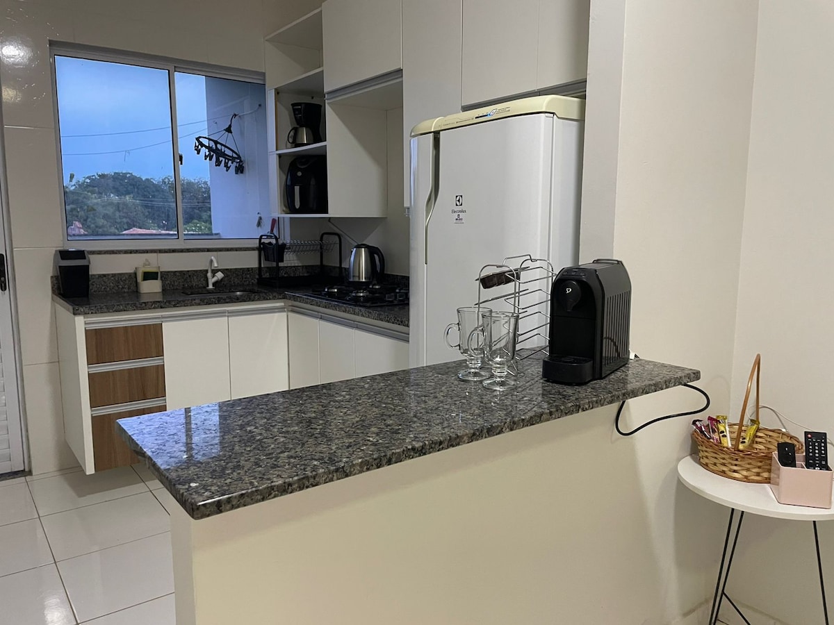 New and cozy studio in Barreiras/BA, in the Renato Gonçalves neighborhood. With a full kitchen, air conditioning, Wi-Fi, TV, washer and dryer and private bathroom. Building with swimming pool, outdoor dining area and gym. 13 km from the airport, 3 km from the historic center and close to Rio de Ondas. Ideal for rest or work. Comfort and hospitality await you! 🌟