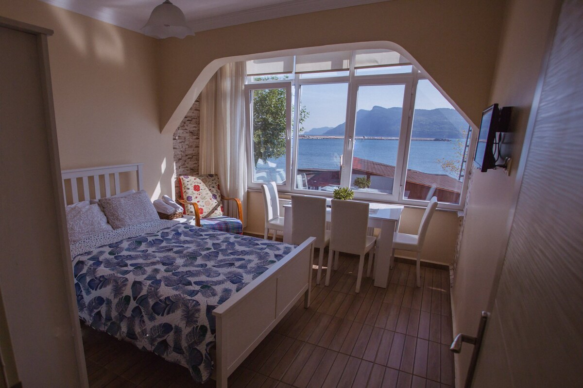 An apartment in Amasra that reflects the unique beauty of the large harbor, where the silhouette of Atatürk is seen in the mountains and the sunrise is watched.