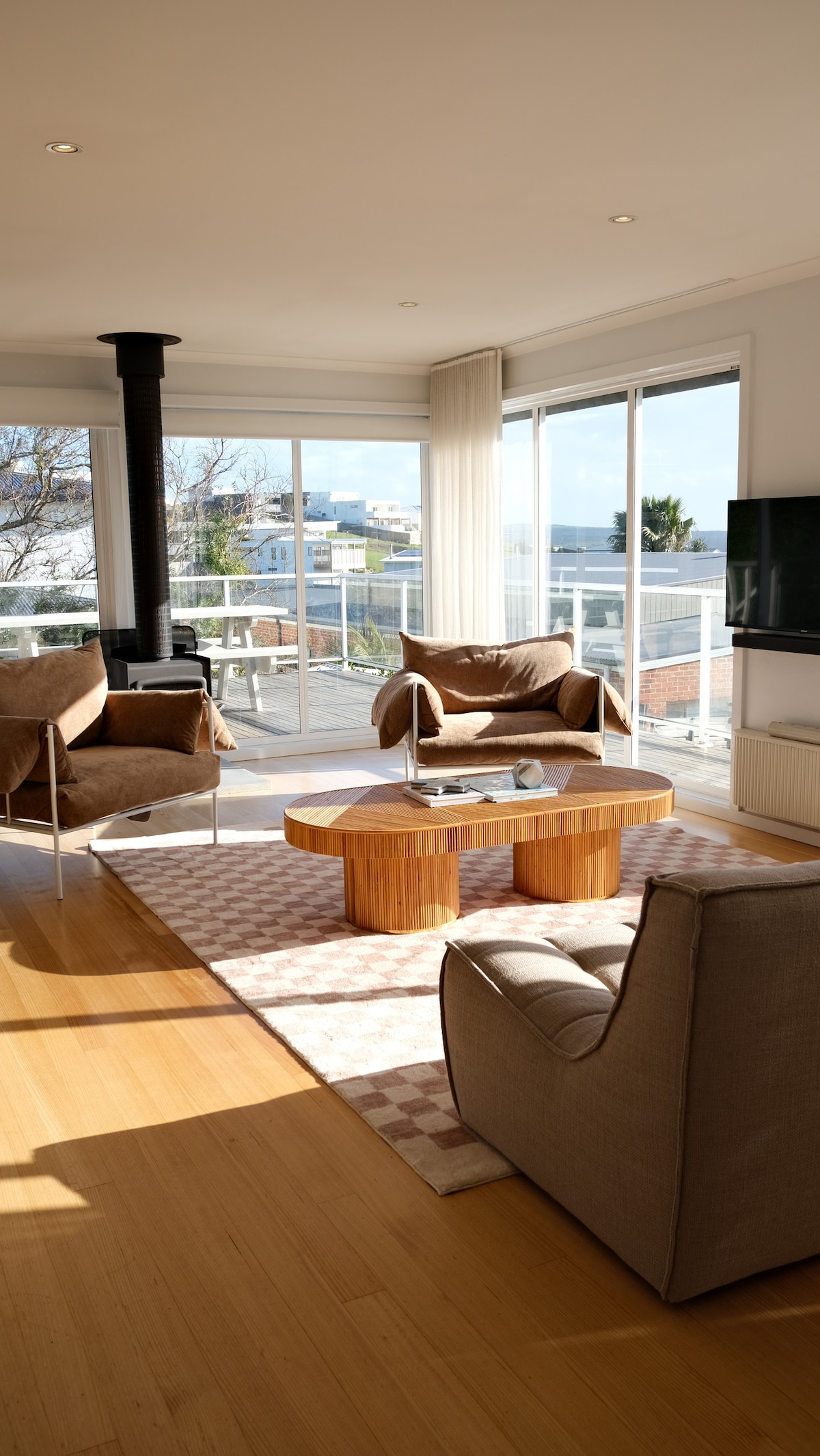 Light, bright and spacious. From the moment you walk in you'll feel calm and relaxed. Fire up the wood fire or simply press a button for instant warmth or cool. Comfy Koala mattresses on beds also equipped with electric blankets. Clean, white stone bench tops and a large cooktop and oven if eating-in is your plan. Stylish and comfortable living spaces. Streamlined bathroom and ensuite, each with a large glass-walled shower. Enjoy the grassy front deck area or sit around the fire pit at the back.