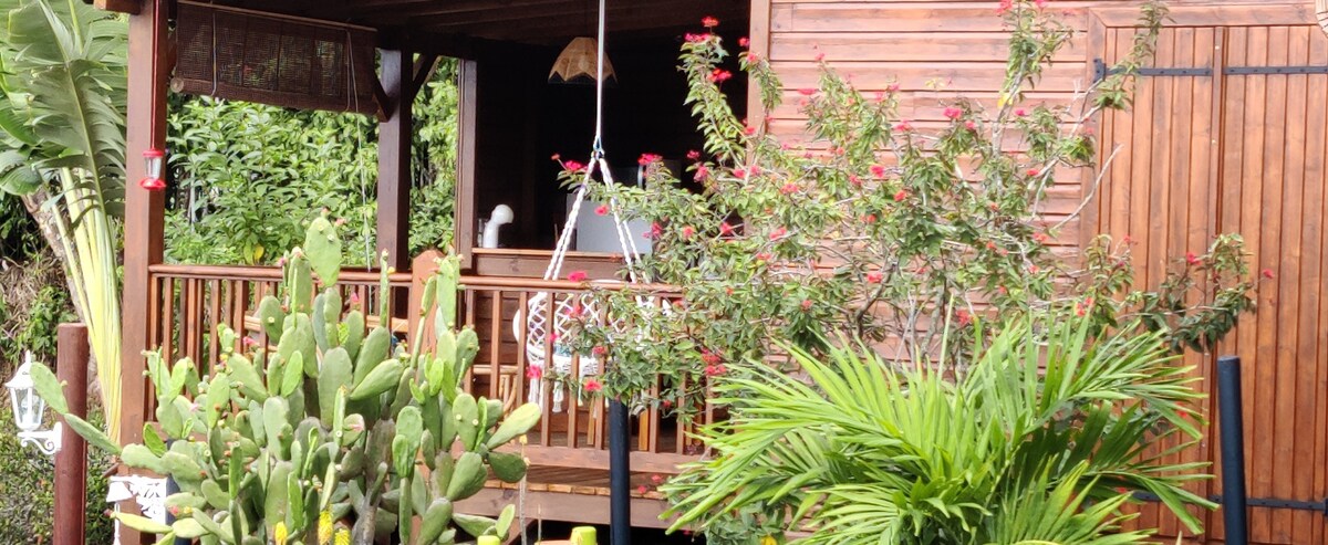 Charming wooden bungalow, rated 3 stars (for 2 people but can accommodate up to 4 people) located close to the seaside and its beaches. It was built in the "cabin" spirit and is located in a well-ventilated area at the entrance to our garden. You will enjoy the sunrise on the terrace when you wake up. At bedtime, you will be intoxicated by the scent of Ylang Ylang and lulled by the song of frogs.