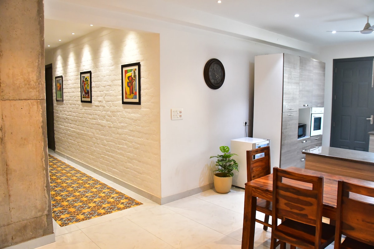 Step into a space where earthy charm meets modern comfort. Nestled in a peaceful, family-friendly gated neighborhood, Studio Sienna is a cozy 2BHK apartment designed for slow living, creative vibes, and warm hospitality. Located on the 2nd floor, the apartment is drenched in natural light and styled with a warm terracotta palette, the interiors are filled with handcrafted decor, rustic wooden textures, vintage finds, and original artworks thoughtfully chosen to make you feel instantly at home.