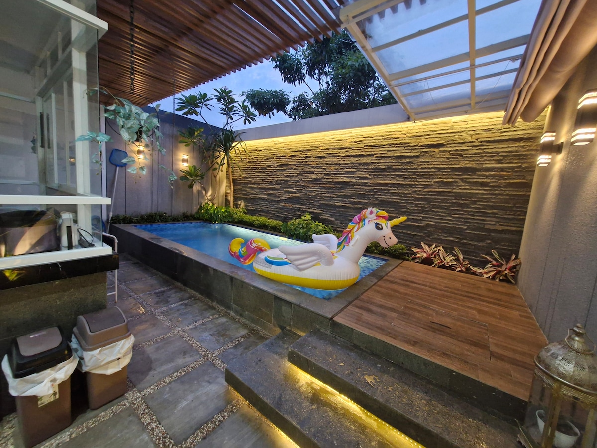 Relax with the whole family at this peaceful place to stay. Taman-Gazebo-Kolam ikan 3 Lantai (roof top-best view) 4 KM (full AC) 3 KT (Heater dan Shower) Wifi Ruang Keluarga (Smart TV-Karaoke) Dapur lengkap (peralatan-logistik) Balkon Luas (bbq - kolam karet anak) Kulkas-Dispenser 2 Unit Kebersihan yang utama, untuk kenyamanan keluarga anda