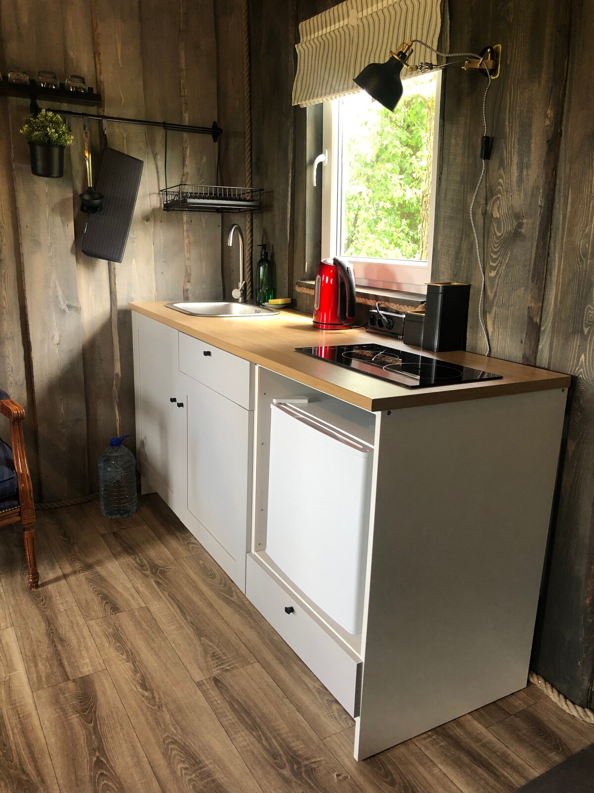 A small, cozy house located 3 meters high in the trees, on the very bank of the Daugava River. A quiet and romantic place if you want to be alone and get away from the noise of the city. The cottage consists of one room with large windows, and which has a double bed, a table, a lounge chair. Morning coffee accessories you can enjoy on the terrace. There is a barbecue with a table and chairs as well as a hammock next to the house. There is a dry Bio toilet on the territory. There is a possibility to rent a boat, SUP boards and a tub.