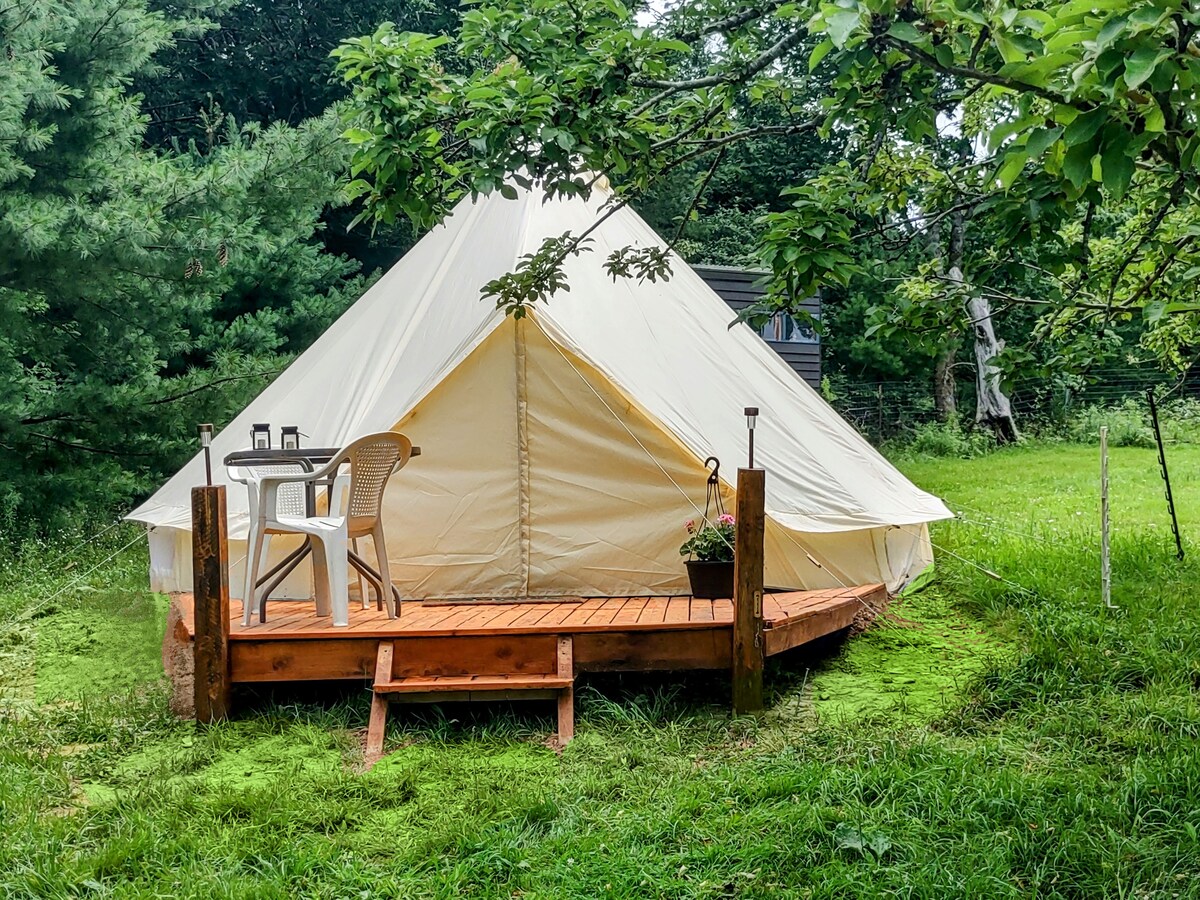Join us at Sweetwood Glamping! Enjoy a unique nature experience on this heritage goat farm sanctuary 'where traditions & nature nurture'. Bella sleeps up to 4 - beautiful furnishings, covered kitchen with gas cooktop & BBQ, hot on-demand shower, powerblocks for electricity, firepit AND a private Hottub! Enjoy hikes, field picnics, goat cuddles, relaxing in nature + charcuterie, cheese classes & more. Short drive to fresh & saltwater swimming. No smoking/pets. Bedding provided.