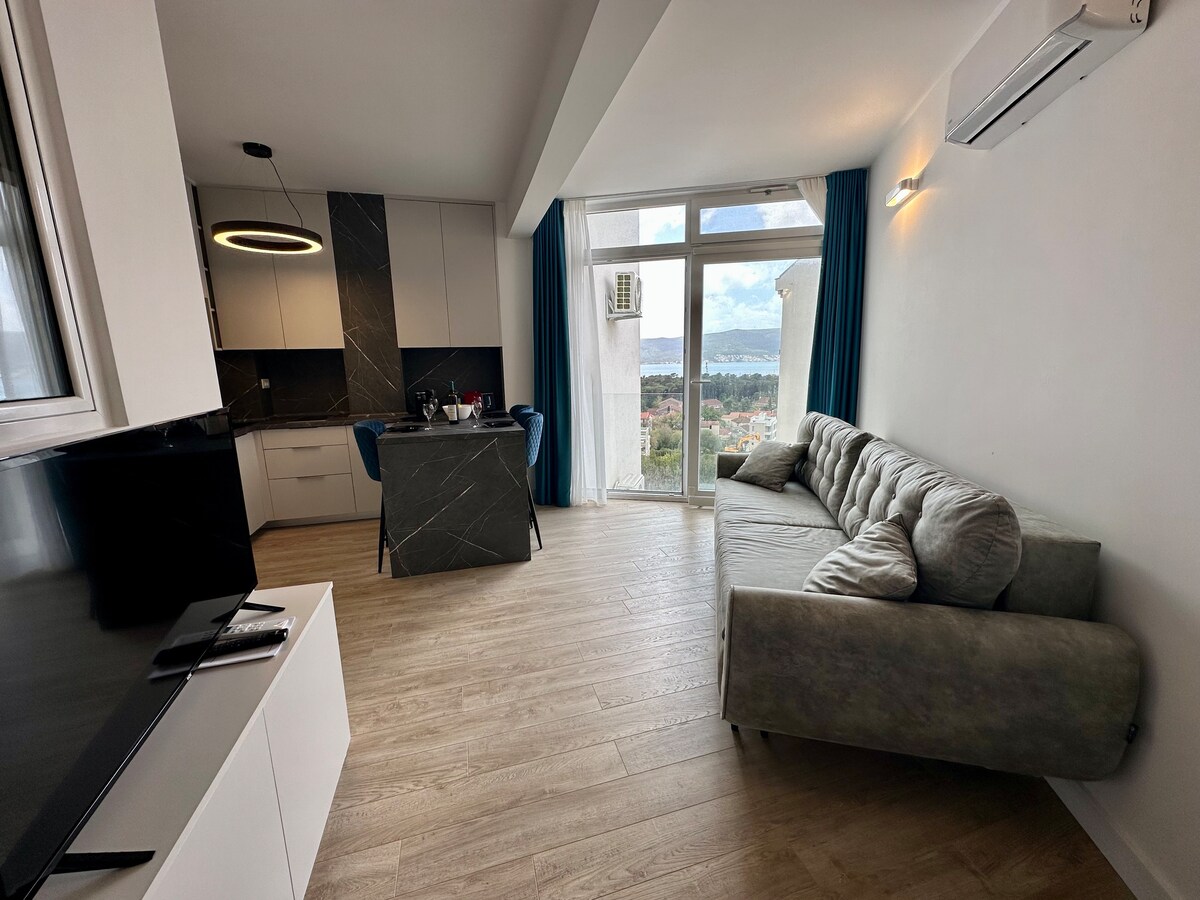 Appartement neuf à Tivat, résidence neuve, vue mer. Piscine panoramique SPA accès gratuit, Jacuzzi, Sauna, Espace détente Accès privatif pour la résidence avec de grandes terrasses, piscine vue mer, vue marina Porto Monténégro. 800 mètres de Porto Monténégro et la mer Cuisine équipée, chambre lit queen size, salon avec canapé-lit, placard spacieux, douche italienne, climatisation Parking gratuit 4 km aéroport *Serviette, literie, ménage inclus *Ouverture piscine selon météo et maintenance