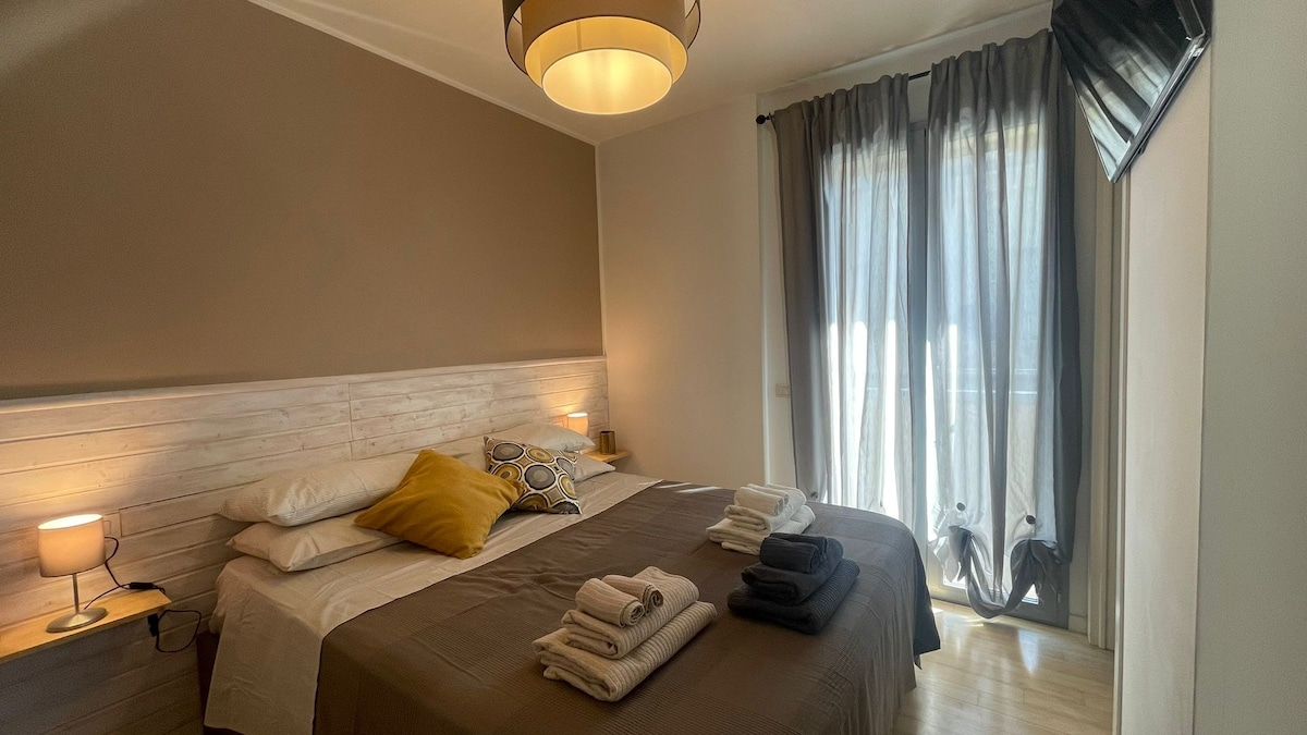 Relax in this quiet and bright accommodation Nice and new two-room apartment in Riccione, a stone's throw from the beach. The accommodation has a double bedroom with walk-in closet, bathroom with shower, living room with sofa bed, modern kitchen and 4 balconies. Independent garage, air conditioning and comfort for a relaxing stay a few meters from the sea! The strategic area offers nearby commercial activities, bars, restaurants, beach bars and evening clubs. Ideal for couples and families!