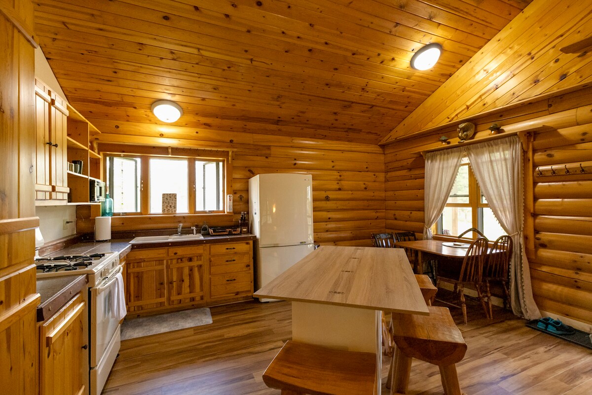 At the top of a rolling hill, surrounded by 20 private acres, sits a beautiful year-round one-bedroom cabin. Built by one of Ely’s top craftsmen, every detail blends a rustic setting with modern comfort, creating a warm and inviting retreat. A stunning wall of windows fills the cabin with sunshine. Thunder rolls overhead during summer storms, and snow falls softly outside in winter—while you stay cozy inside, feeling completely connected to nature. It’s truly a romantic place to stay.