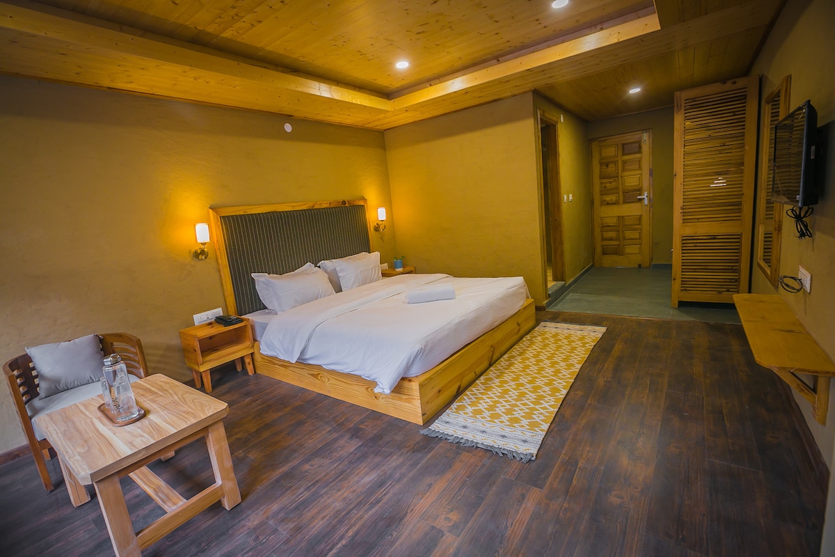 A cozy boutique mountain room wrapped in warm wood interiors and floor-to-ceiling views of the Himalayas. Wake up to sunlight, sip your coffee by the window, and unwind in a peaceful, stylish space designed for comfort and relaxation. Perfect for couples and travelers looking for a serene stay near Manali. This stylish and unique place sets the stage for a memorable trip.