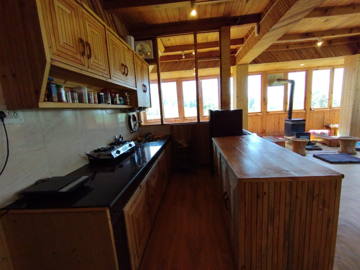 Rooms are furnished with double bed adjacent to the snow capped mountainside window and attached washroom with respective rooms. Drawing room is your workstation and ample space is provided with work from home setup. Along with these amenities, We take care of not so regular dining table. The traditional dinning tables have been arranged for nice supper. We provide you with fully functional kitchen having gas stove and utensils.