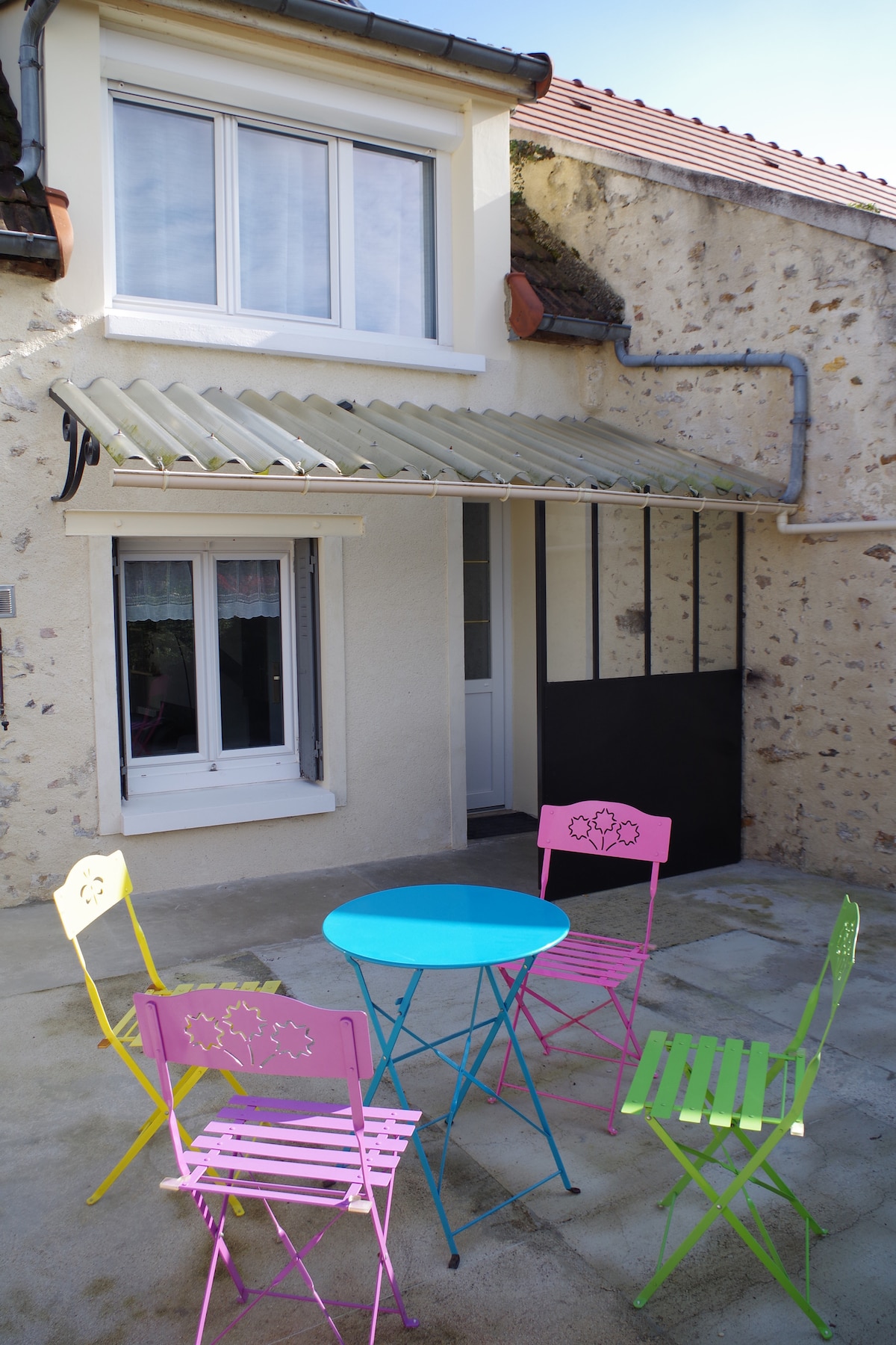 In an old farmhouse, very charming, with its touch of modernity You can enjoy the garden and its deckchairs for the beautiful sunny days and you can enjoy the above ground pool. Housing of 45m2, with its exposed stones is composed of a bedroom and kitchen very functional and bathroom (shower) / WC. You will have walking access to the shops and the medieval town. The house is 500m walk from the TER to Paris and 1 hour by bus to Marne la Vallée.