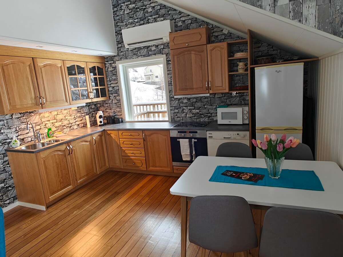 Studio apartment separate entrance. Windows facing a garden and the midnightsun/ sea / northern lights. Gardentable, garden chairs. Doublebed 150cm High speed wi-fi, cable tv. Kitchenette, two plates stove. Tea & Coffee and BREAKFAST included. Microwave, Fridge/freezer necessary equipment. Dinnertable for two. Bathroom with window. Washing machine + dryer. Located in central Narvik in a quiet part of town. 9min walk city center, railwaystation and flight bus. 3min walk to a small beach.