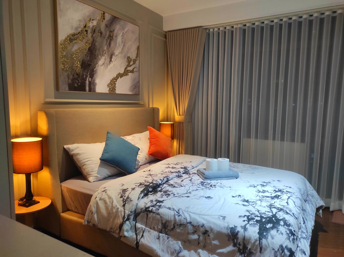Stay in this unique and stylish mid-century modern LOFT with AMAZING & UNOBSTRUCTED SUNSET and CITY VIEWS in Gramercy Residences, a 5-star condo centrally located in Poblacion. Enjoy this brand-new, centrally-located 1 Bedroom Loft w/ stunning design & original artworks. Located in a high floor w/ 5-star amenities, fully-fitted kitchen, balcony & everything you need for a perfect stay: 300Mbps Fiber WiFi, Netflix, 55-inch smart TV, infinity swimming pool, modern gym, sauna & 24/7 concierge etc.