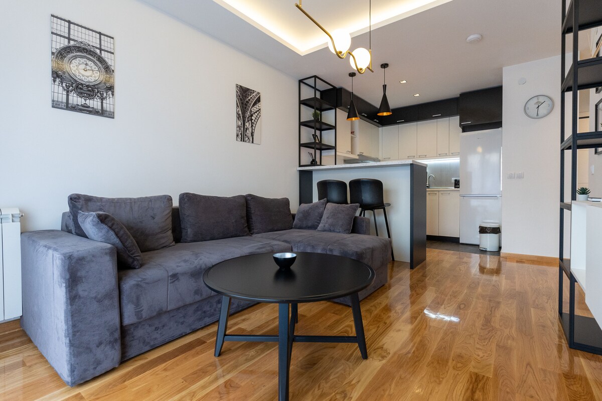 **Charming Urban Oasis** Nestled near the iconic Parliament Palace, this beautiful apartment situates you in the heart of the city. Just outside your door, you'll find delightful shops and cozy cafés. The apartment boasts a modern interior with an open-plan living and cooking area. Two light-filled bedrooms provide a serene retreat, blending coziness with sophistication. Located within walking distance to Terazije Square, Knez Mihajlova Street, and the historic Skadarlija district.