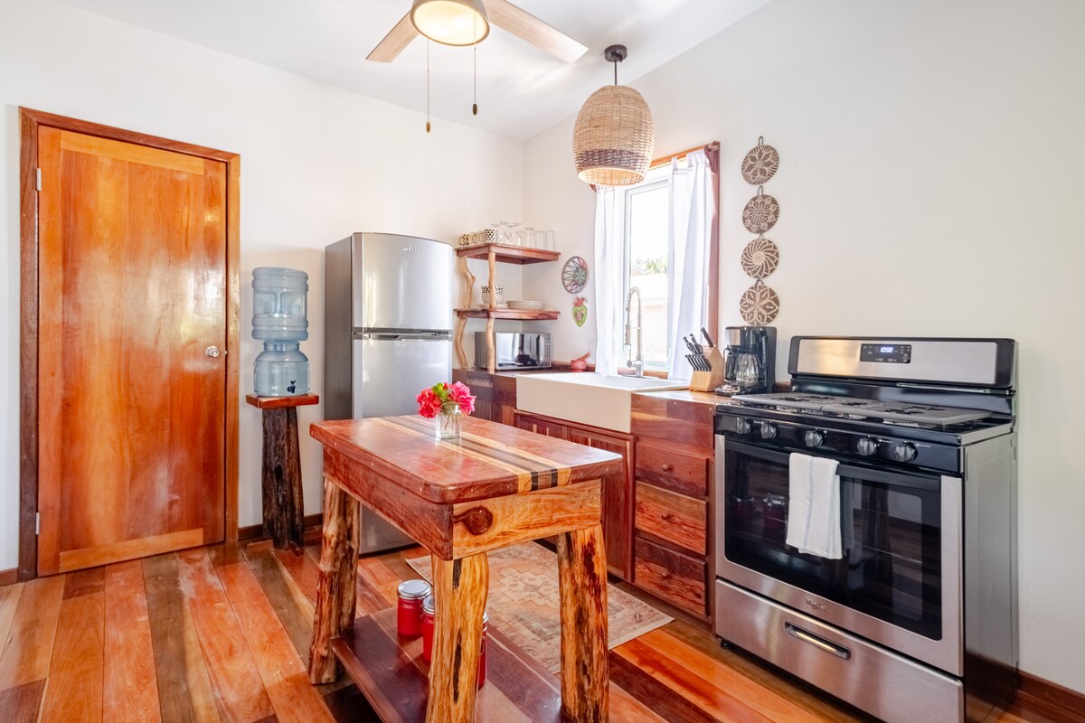 We have Gold Standard certification. This Guesthouse exists of two rooms: a full bed and a futon bed in the second room, a full kitchen, with custom designed Mahogany cabinets, and a spacious enclosed porch. It is fully furnished, with local art enhancing the walls. Private toilette and separate shower room. Five minute walk to super markets, restaurants, and the bus station. The ten minute walk to the center of town is safe. We offer gated parking. We speak English and German.
