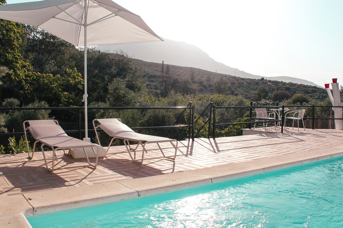 Situado en el corazón de Sierra Mágina, permite desconexión y tranquilidad. Magníficas vistas ofreciendo una panorámica única. Espacios exteriores con amplia terraza/solarium, piscina, barbacoa exterior, porche acomodado, patio andaluz trasero y entrada con parking privado. El interior compuesto por dos habitaciones con tres camas, dos camas individuales y una grande (con posibilidad de dos camas supletorias) , un salón-comedor, una cocina equipada con barra americana y un baño con ducha.