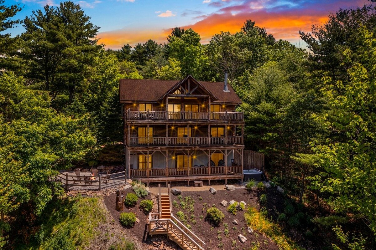 Escape to this luxurious 5BR Pocono log cabin with stunning winter lake views. Unwind in the private hot tub, gather around the firepit, or sip coffee on one of three decks blanketed in snow. Inside, enjoy a cozy fireplace, game room with foosball, Smart TVs, and a handcrafted dining space—perfect for family time, snowy weekends, or holiday getaways. Peaceful, spacious, and made for togetherness, it’s your dream winter retreat by Beltzville Lake.