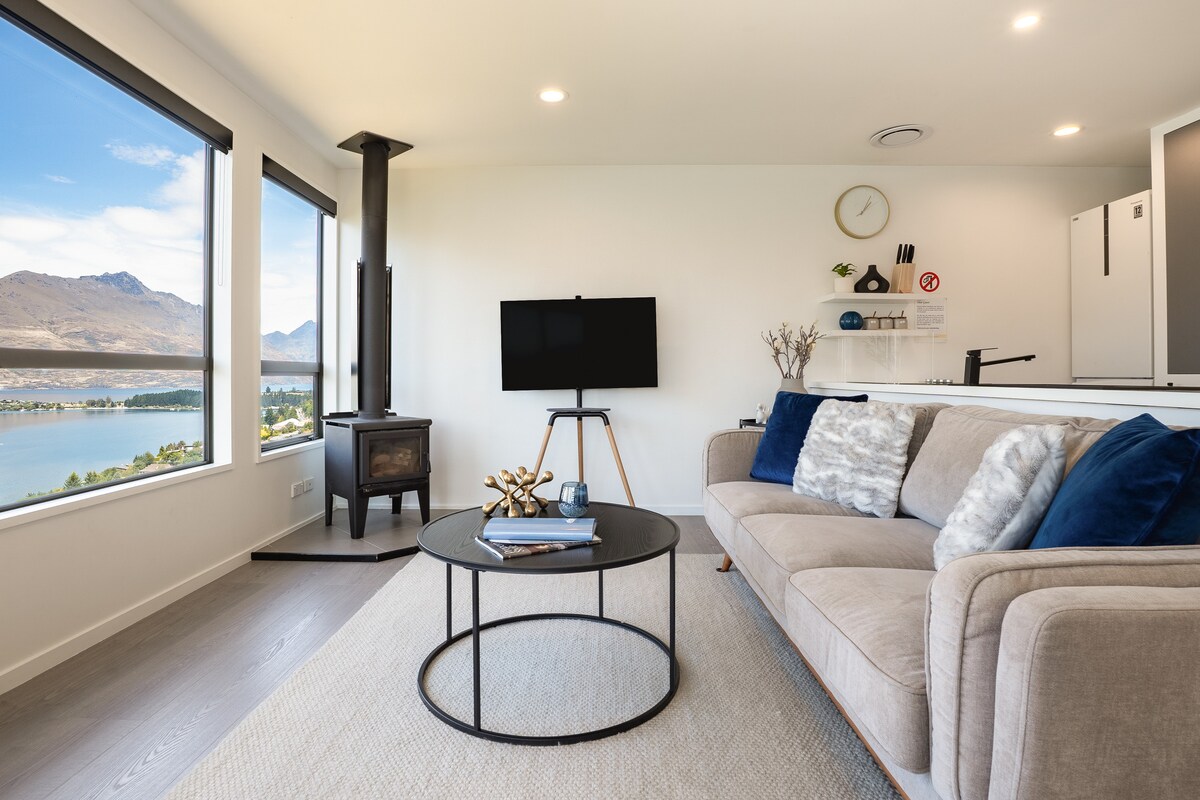 Private, warm, sunny studio in Kelvin Heights with panoramic views over Lake Whakatipu, snow capped mountains and Deer Park. The studio features underfloor heating, a plush Queen bed, fully equipped kitchen, comfortable lounge, dining table and Netflix. Every window is a postcard. We are just 3km from the airport, Remarkables Park shopping centre, and the Remarkables skifield access road, as well as being a short stroll to the lake and Queenstown trails.