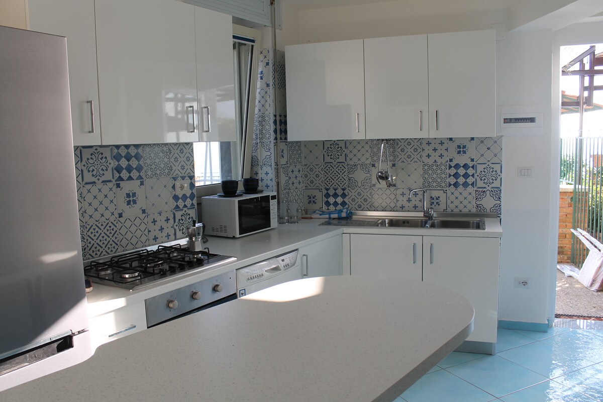 Apartment in Villa Emilia with panoramic view of the Gulf of Salerno. Entrance suitable for people with motor disabilities. The car can be parked inside the villa. Kitchen with 5 burners; two double bedrooms both with air conditioning and en-suite bathroom. Very large terrace with awning, wrought iron table and chairs with Vietri ceramics, deck chairs, barbecue, wood-burning oven and outdoor shower. Ideal for children and the elderly because they can also enjoy the outdoors