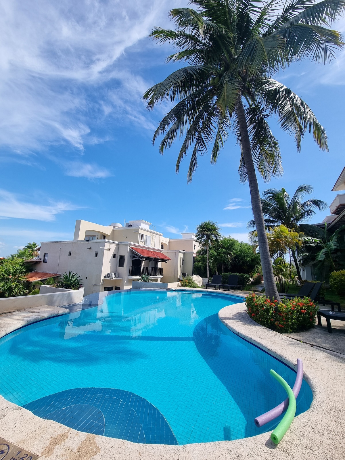 A Perfect SMALL 1 Bed Studio place for 2 Nestled in the middle of the Zona Hotelera of Cancun. 5 min walk to beautiful Ballena Beach, next to Hard Rock Hotel , Secrets the Vine, Sandos Hotel. Studio in a private oasis, located in a 5 Villas private gated community. You will have an independent entrance, with no stairs to climb, two pools directly in front of the Studio, green space, and palapa. A queen bed (sleeps two)