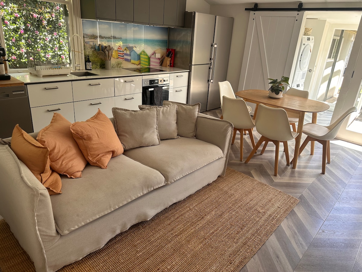 This recently renovated guesthouse is separate to the main house. • Entire guesthouse is yours • Pet friendly • Large open living area • Your own private entrance & driveway It’s private and very quiet, which makes it the perfect retreat for a family or a group of friends. Bedroom 1 has a queen bed, bedroom 2 a double bed and the living room has a large comfortable sofabed. The kitchen is fully equiped & the living room opens up to a large al fresco area - perfect for entertaining.