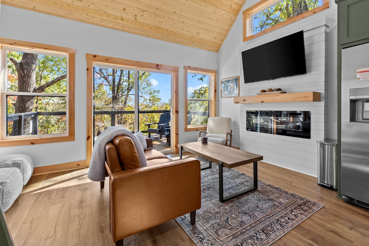 Escape to a brand-new, 2-story treehouse near Beaver Lake! Enjoy nature views from the deck with a recessed stock tank hot tub, stay cozy with an electric fireplace, and cook in the fully stocked kitchen. This unique retreat offers 2 bedrooms (one is a loft accessed by ladder), 3 beds, and sleeps 5. With fast WiFi and a mini-split HVAC system for room-specific climate control, you'll feel secluded yet close to Rogers' attractions. Perfect for a peaceful, modern getaway!