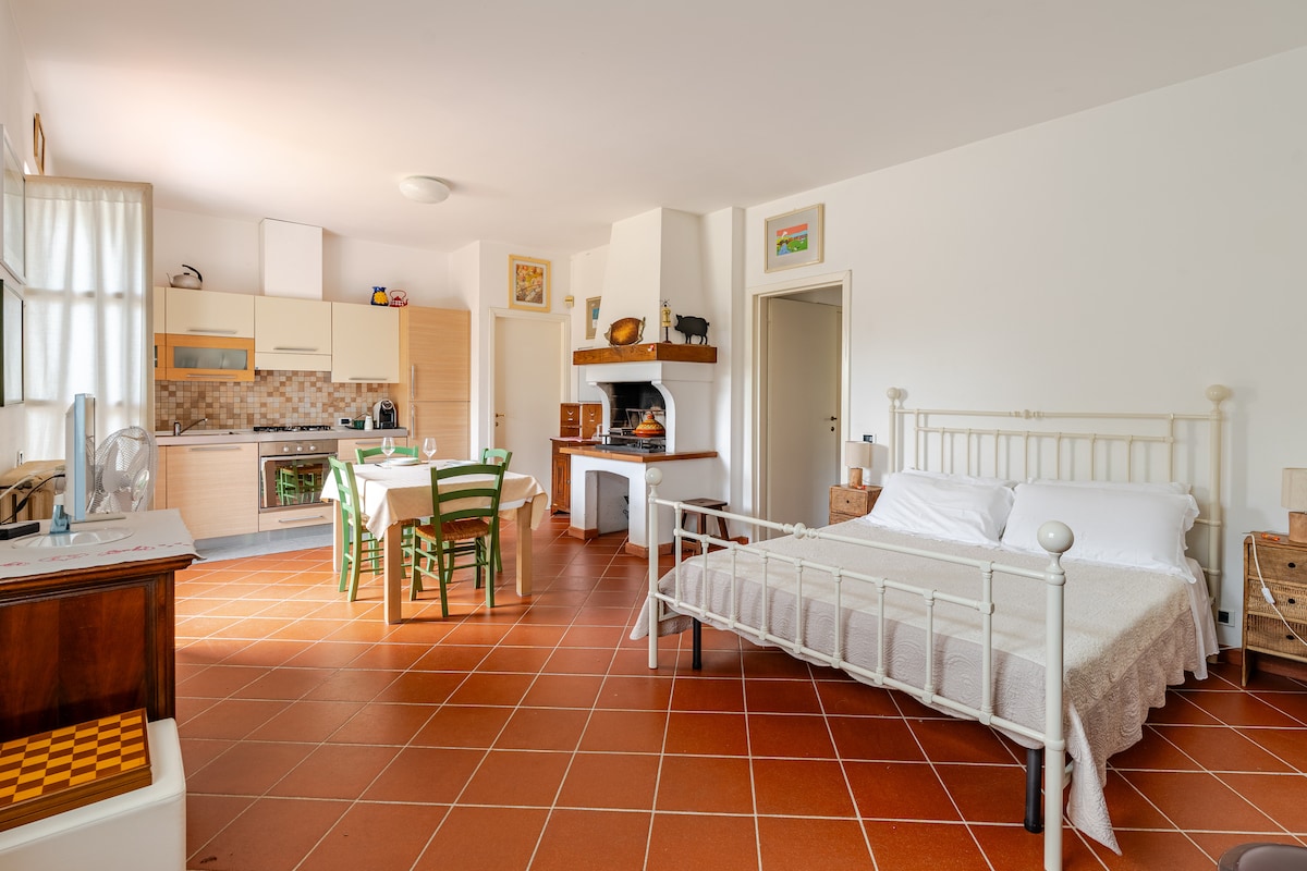 On the first floor of a rural villa in the countryside, private entrance, you can take advantage of the large terrace for lunch or to relax. The house is surrounded by fenced land, with numerous parking spaces, views of the sea and the city. Chestnuts, olive trees, organic garden. A few kilometers from the center of Carrara, Cave di Colonnata, Apuan Riviera Beach, Cinque Terre, Pisa, Lucca, Forte dei Marmi, Fir. Privacy and tranquility characterize the stay in the house. Basic Italian cooking classes are available