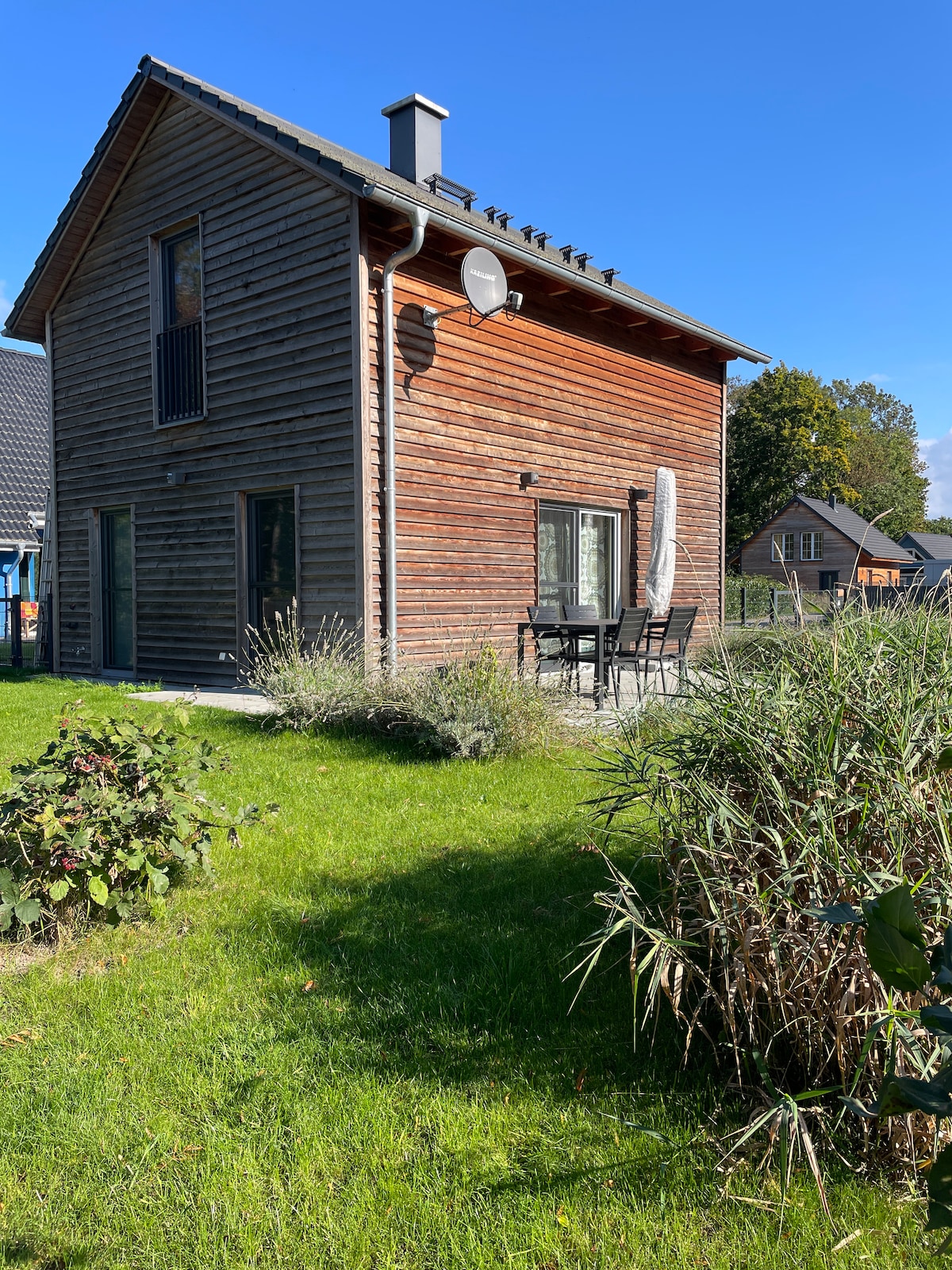 ... look out of your bed onto the water, enjoy the peace and quiet and listen to the rustle of the beech forest, experience bike tours directly on the water and enjoy nature. A beautiful, modern and rustic, low-energy half-timbered house with thatched roof, Moroccan tiles, oak floorboards and clay plaster walls awaits you. For activities there is a beautiful large garden with a forest swing, free steam sauna, outdoor shower and tub, a standup paddle, a paddle boat and 4 bicycles.