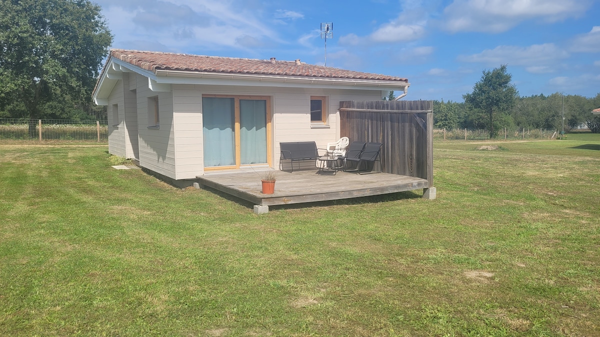 A CONTEMPORARY, COMFORTABLE AND BRIGHT CABIN WITH ITS LARGE WOODEN TERRACE FACING THE PRAIRIE, ON THE EDGE OF THE NATURE RESERVE AND THE VILLAGE OF ARJUZANX, IN THE IMMEDIATE PROXIMITY OF THE LAKE; IDEAL FOR RESTING AND RELAXING.
