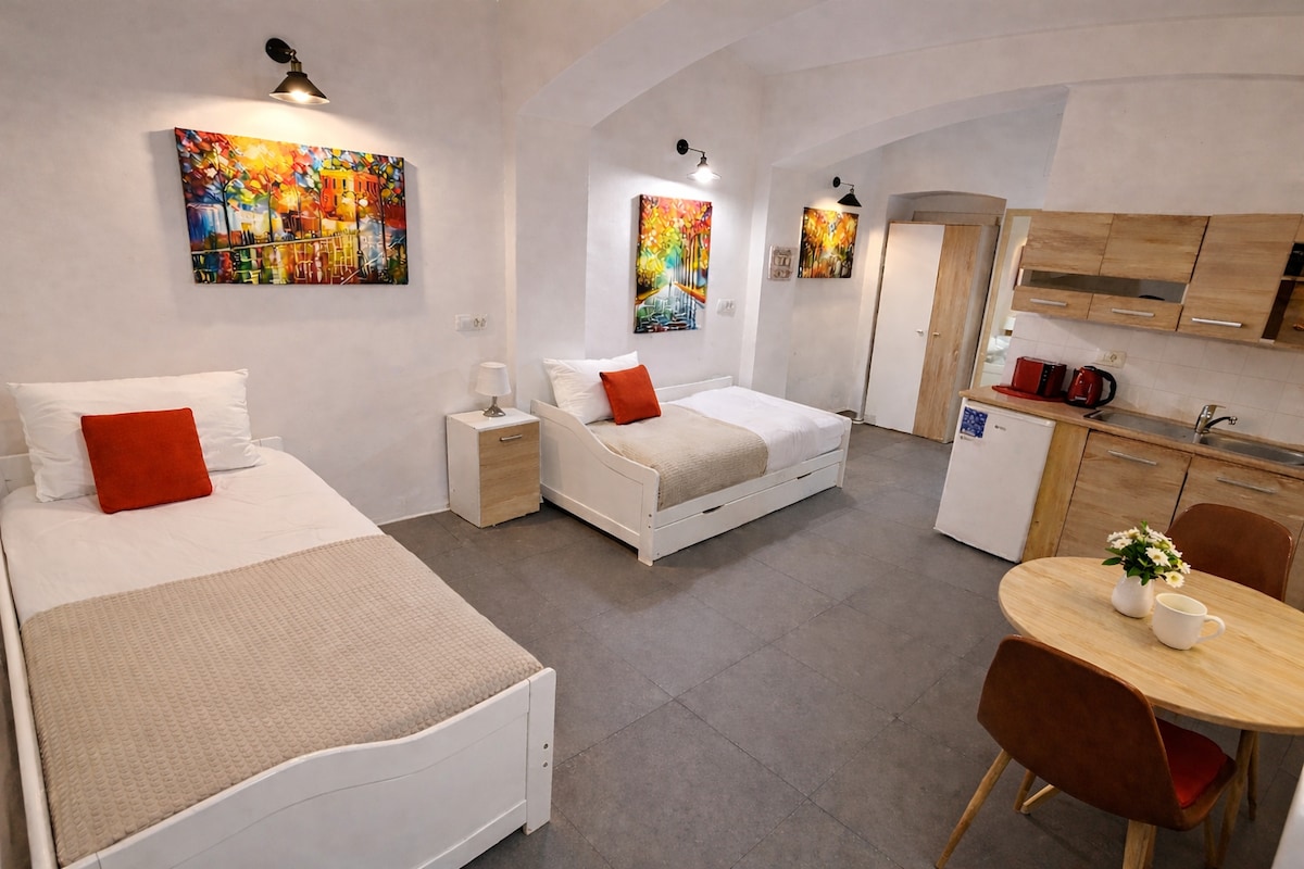 This immaculate and spacious apartment will be your oasis in the very heart of the city overlooking the castle Unbeatable location inside the quiet pedestrian zone with walking distance to the Triple & Dragon Bridge and the Central Market. Surrounded by many amazing restaurants, cafes, bbq&bars Comfortable single and queen (160cm) beds and attached bathroom with a shower. A smart 40" TV, microwave and refrigerator, as well as seating area. Linens, towels, toiletries, washer&dryer are provided