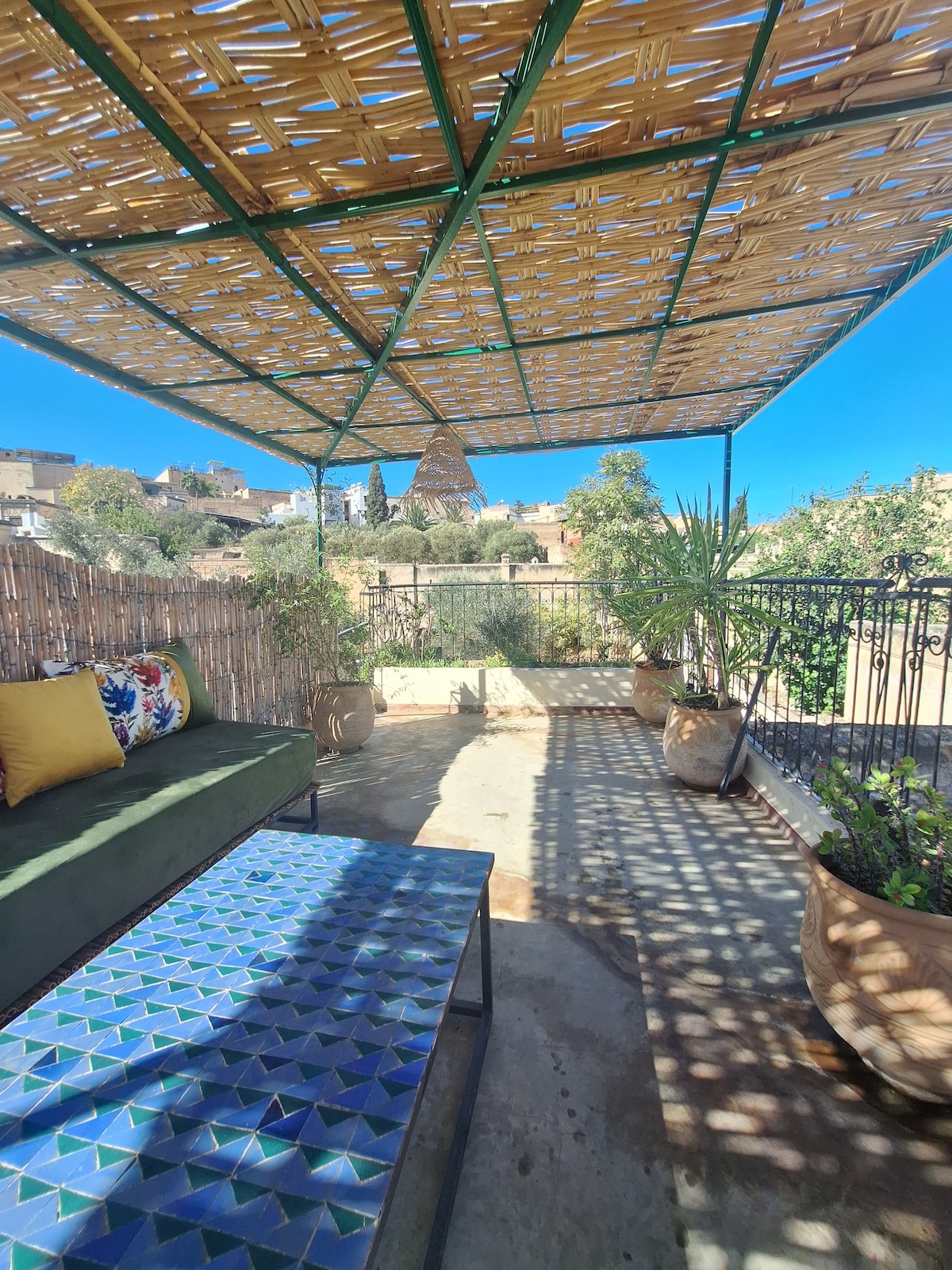 A Fassi traditional house located in a residential area of Fes El Bali between palaces Mokri and Glaoui, it offers a magnificent view on the medina. Very bright and overlooking a charming small garden with lemon trees and in the middle a pond where to find freshness during summer. Everything here incites to peace and rest. This house is ideal to welcome one or two couples with children. Guests from all countries are welcome.
