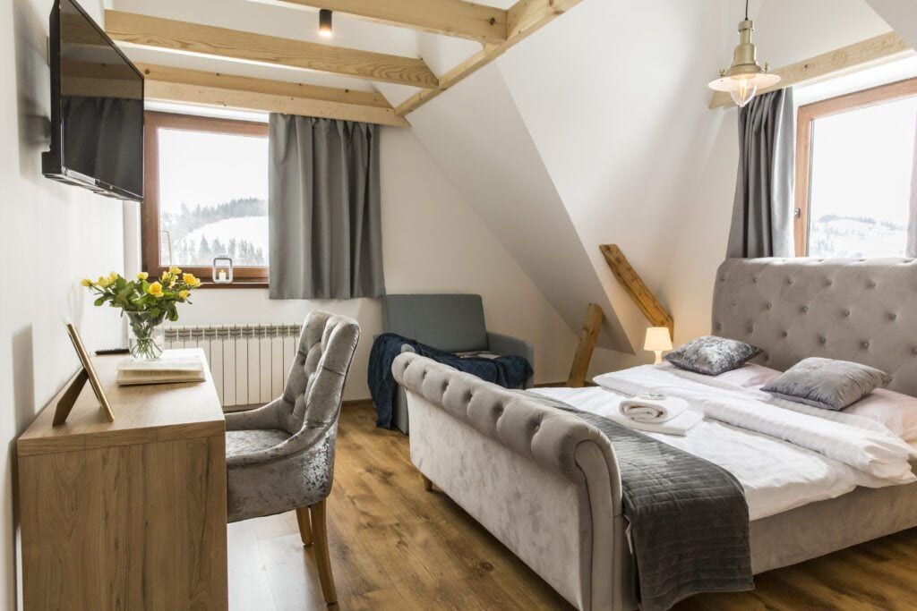 Grand Chalet is a luxurious 250 sqm villa in the heart of Podhale with a panoramic view of the Tatra Mountains. Guests can enjoy: 4 air-conditioned bedrooms, 4 bathrooms, a jacuzzi with a view, a sauna, a game room with billiards and PS5, a fitness area, a fiber optic work room, a children's corner, a fireplace and a year-round barbecue. The villa offers comfortable accommodation for 10 people. The perfect place for a family holiday, meeting friends or a workation – comfort, modernity and a unique atmosphere in one.